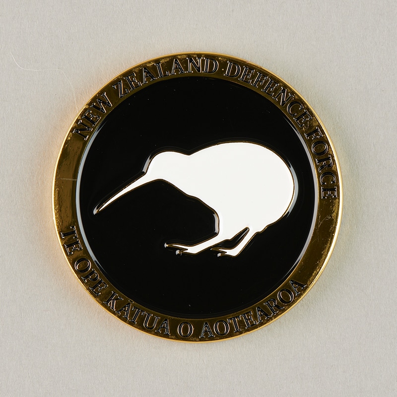 Challenge coins are made with a group or organisation symbol on them, and they represent membership or belonging. This challenge coin was made for the 2023 New Zealand Invictus Games Team. Julie Fitzell Collection.