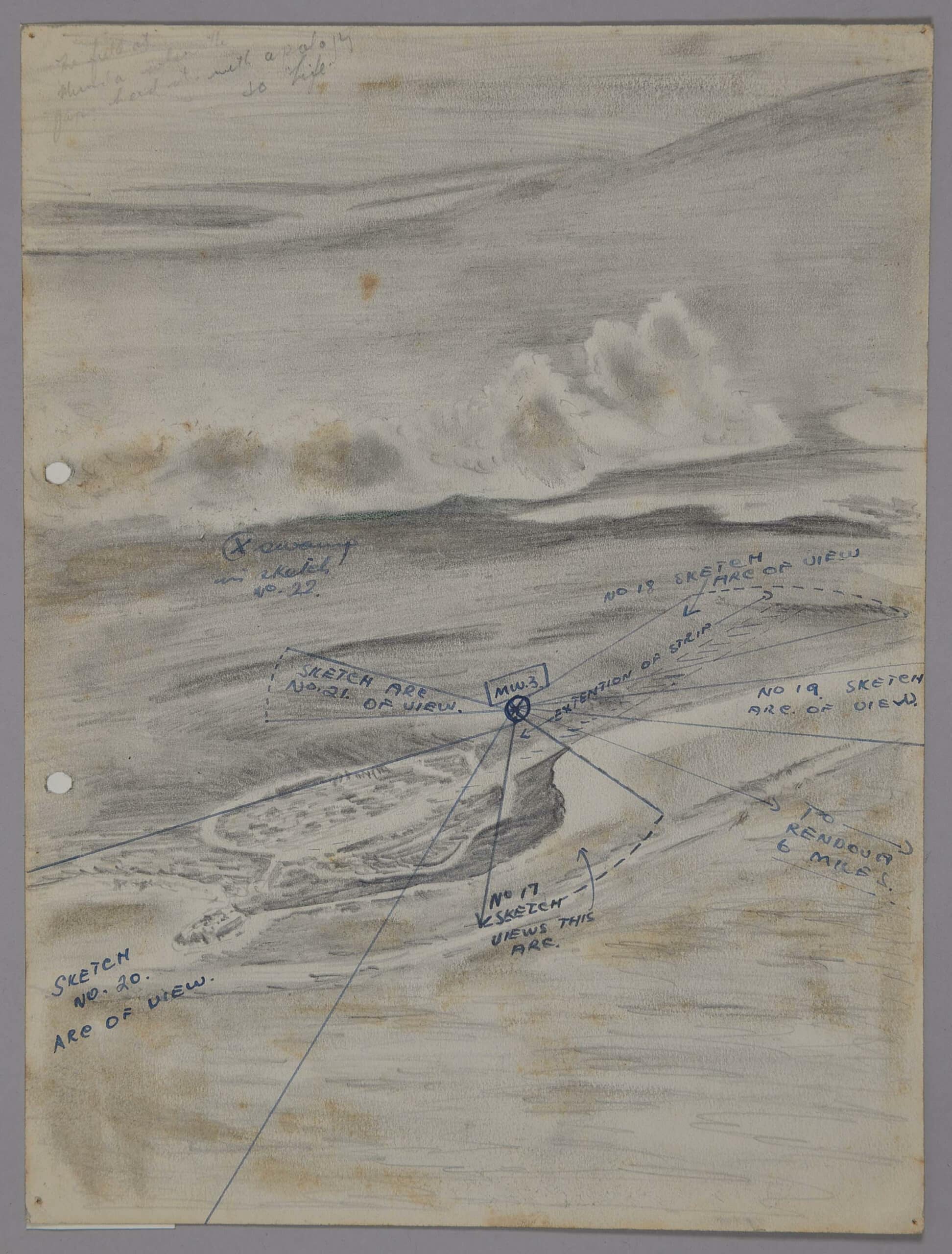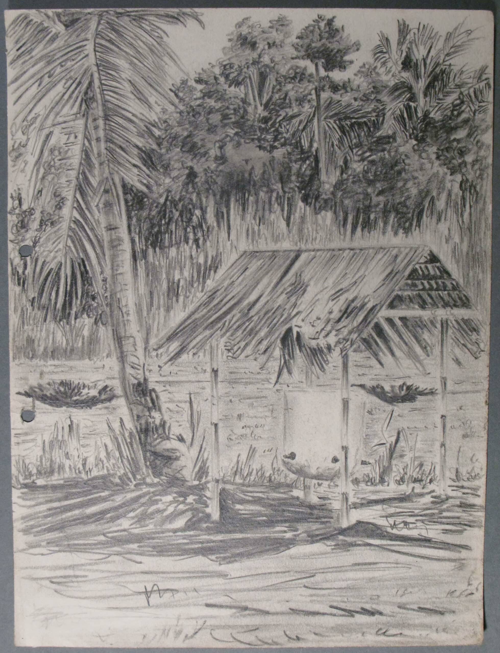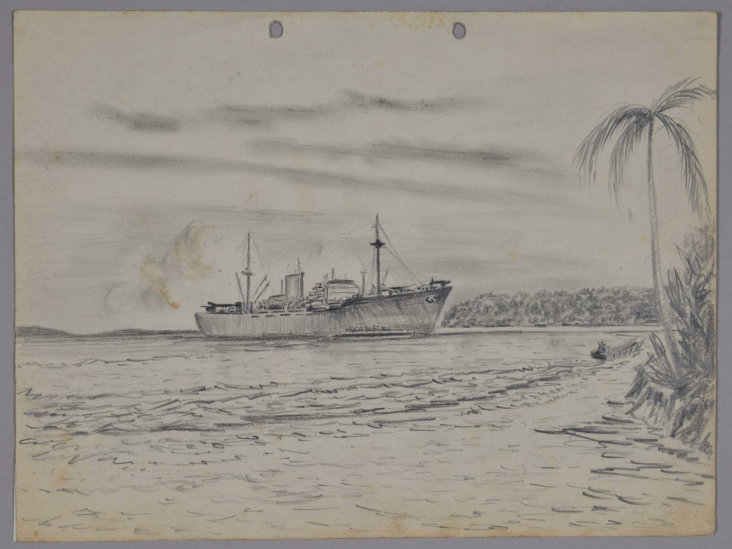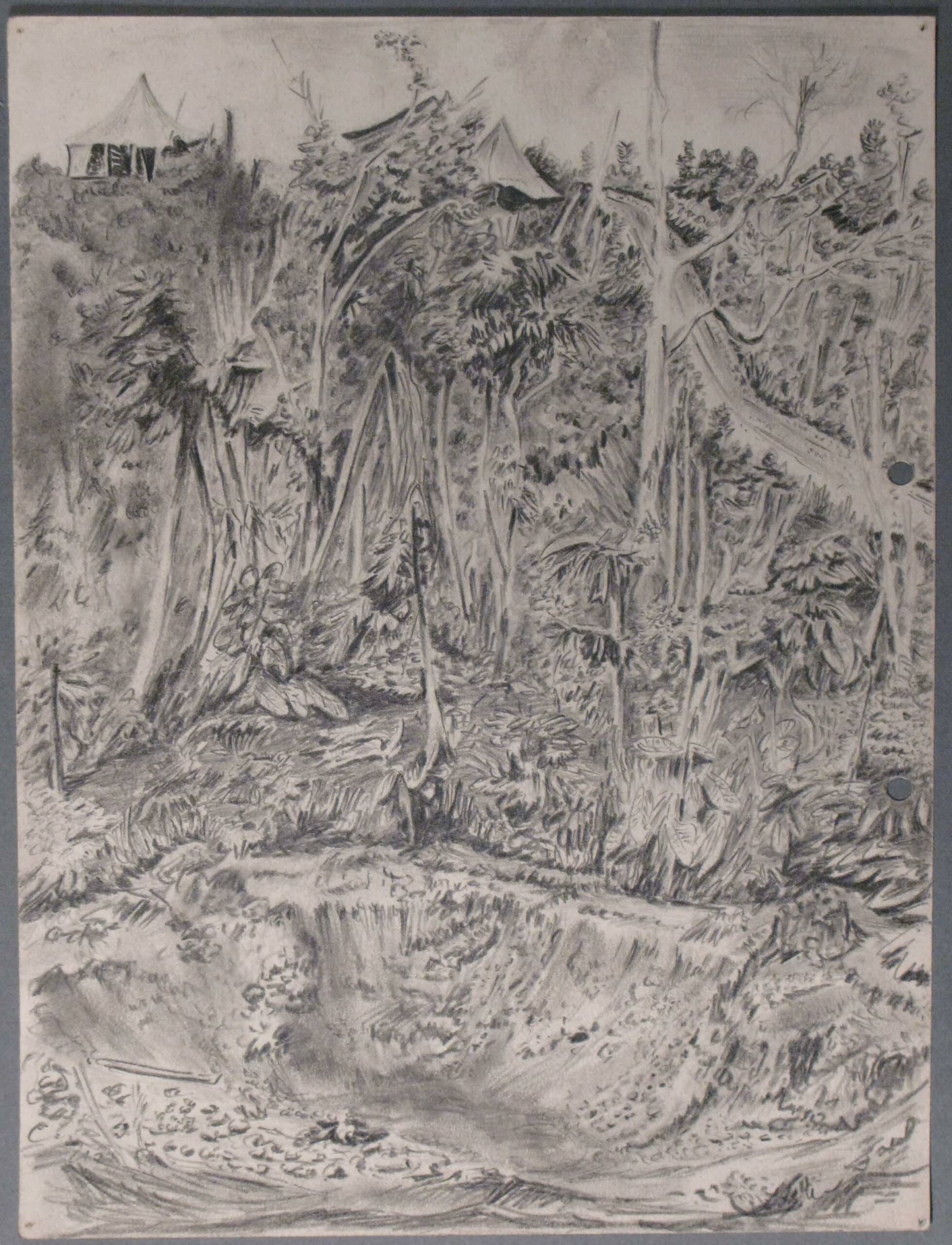 Owen (Miles) Spence falls into the category of “unofficial” artist, documenting his experience on his own accord. He was born in Christchurch in 1922 and enlisted as a radar operator in the Navy in 1941 at the age of 18. He trained at HMS Tamaki and Philomel, following which he was posted to HMNZS Cook in Wellington. In June 1943, he was promoted to Able Seaman Radar Operator, and around this time was posted to a radar station on Cuvier Island. From August of the same year, Spence was posted to the administrative base HMNZS Cook II in the Solomon Islands.
