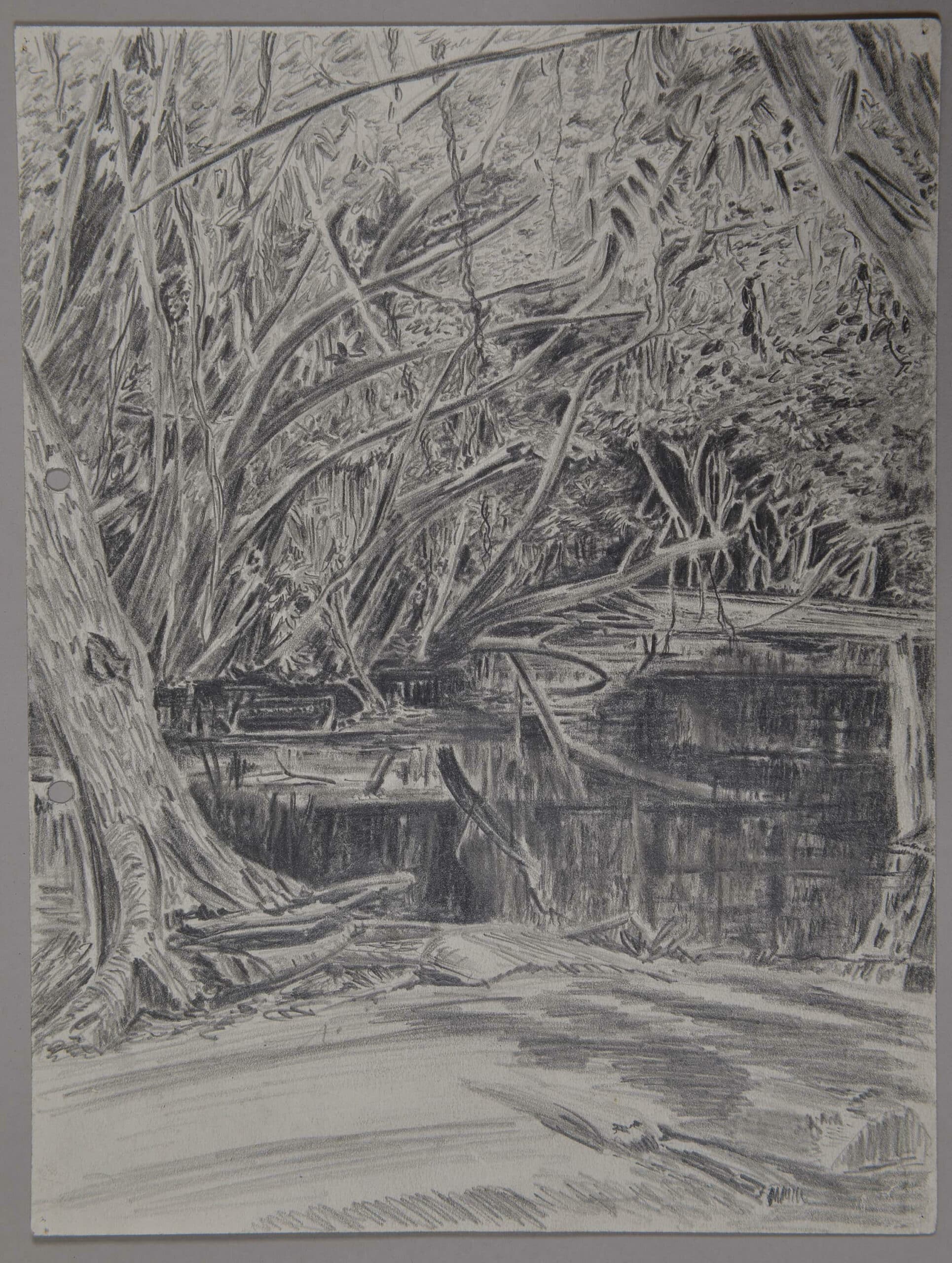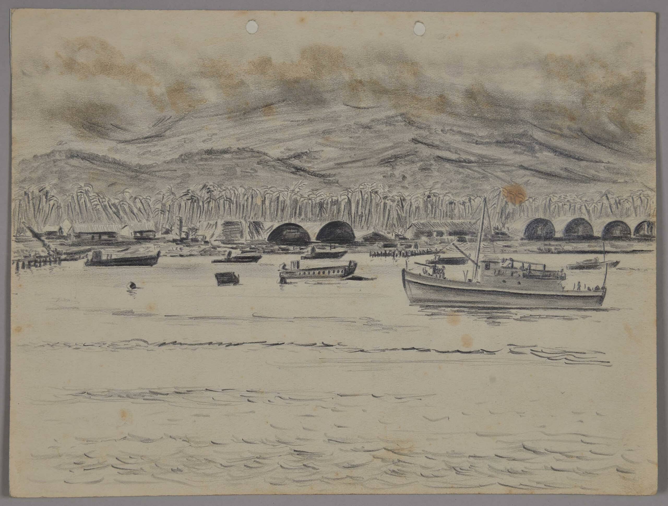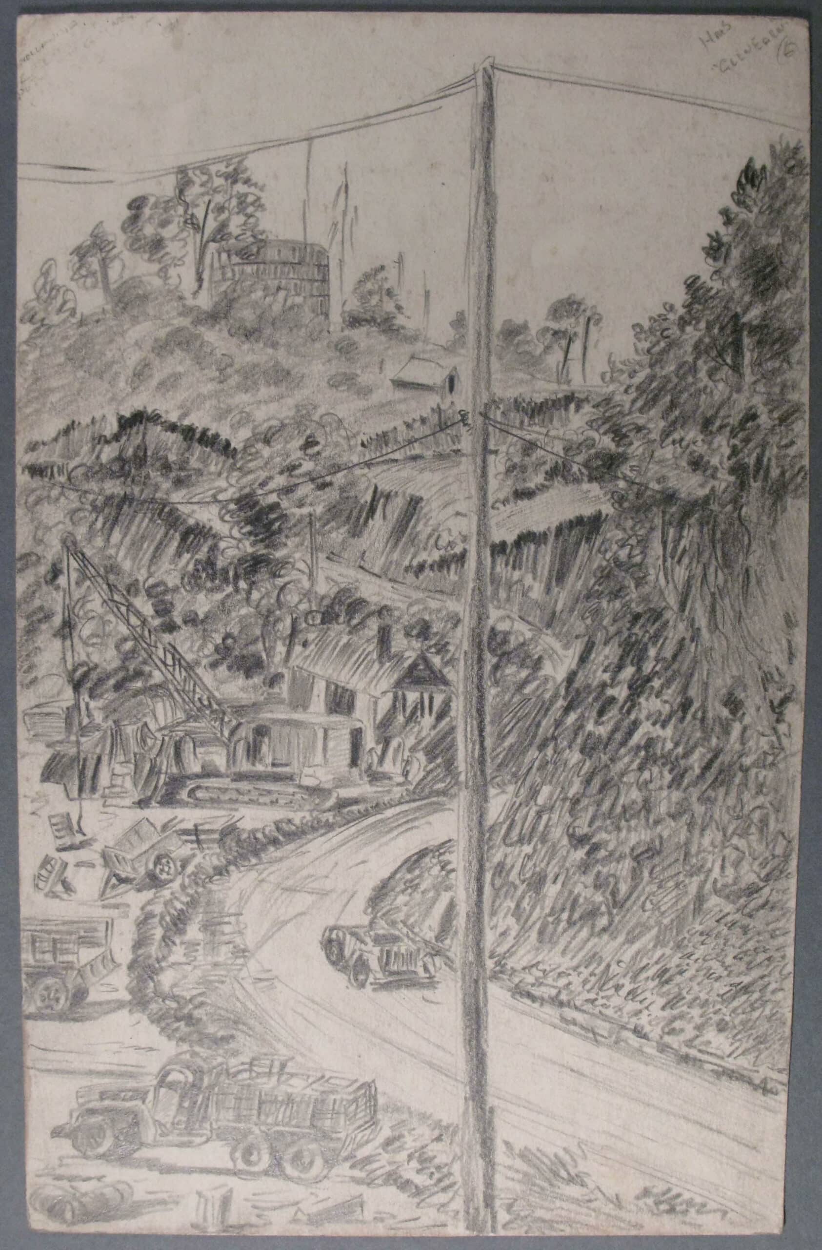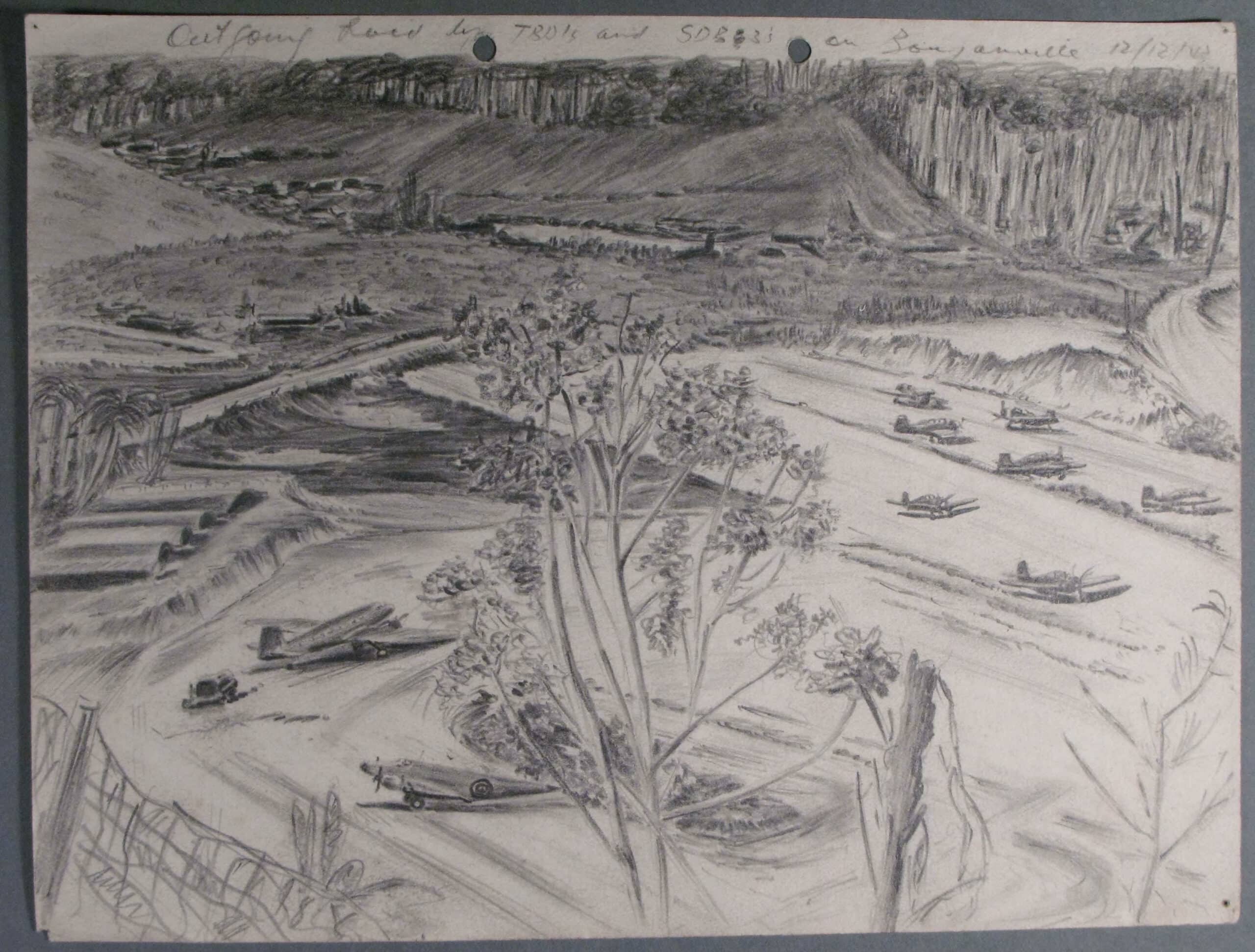 Owen (Miles) Spence falls into the category of “unofficial” artist, documenting his experience on his own accord. He was born in Christchurch in 1922 and enlisted as a radar operator in the Navy in 1941 at the age of 18. He trained at HMS Tamaki and Philomel, following which he was posted to HMNZS Cook in Wellington. In June 1943, he was promoted to Able Seaman Radar Operator, and around this time was posted to a radar station on Cuvier Island. From August of the same year, Spence was posted to the administrative base HMNZS Cook II in the Solomon Islands.
