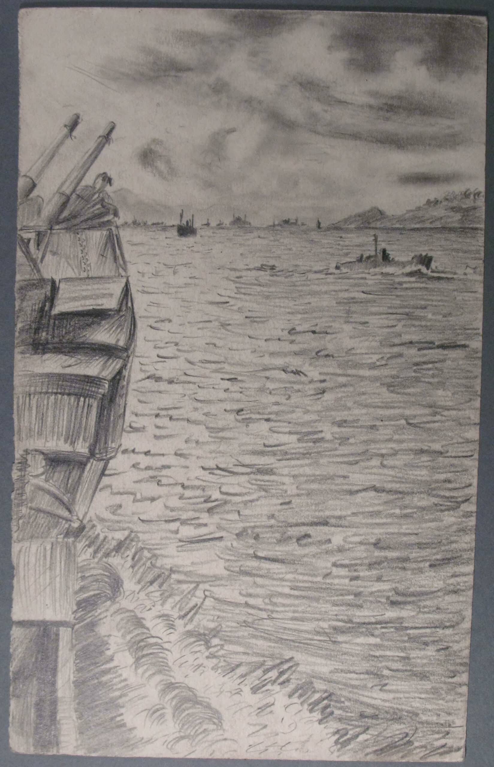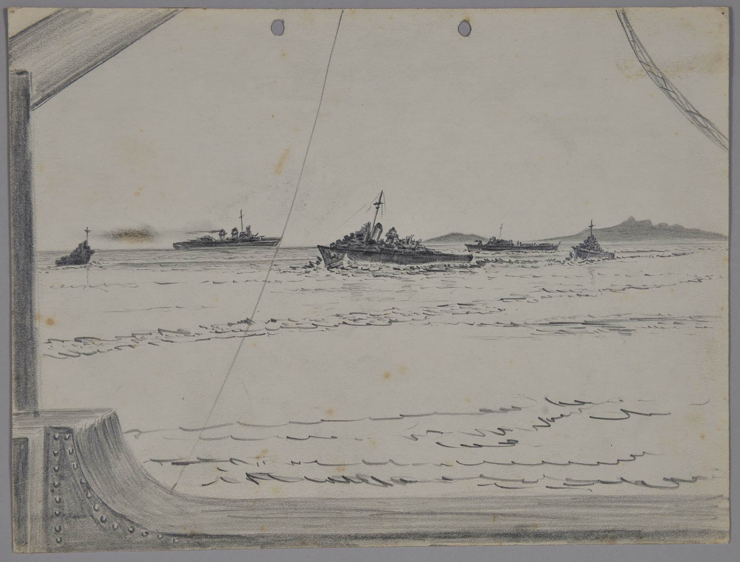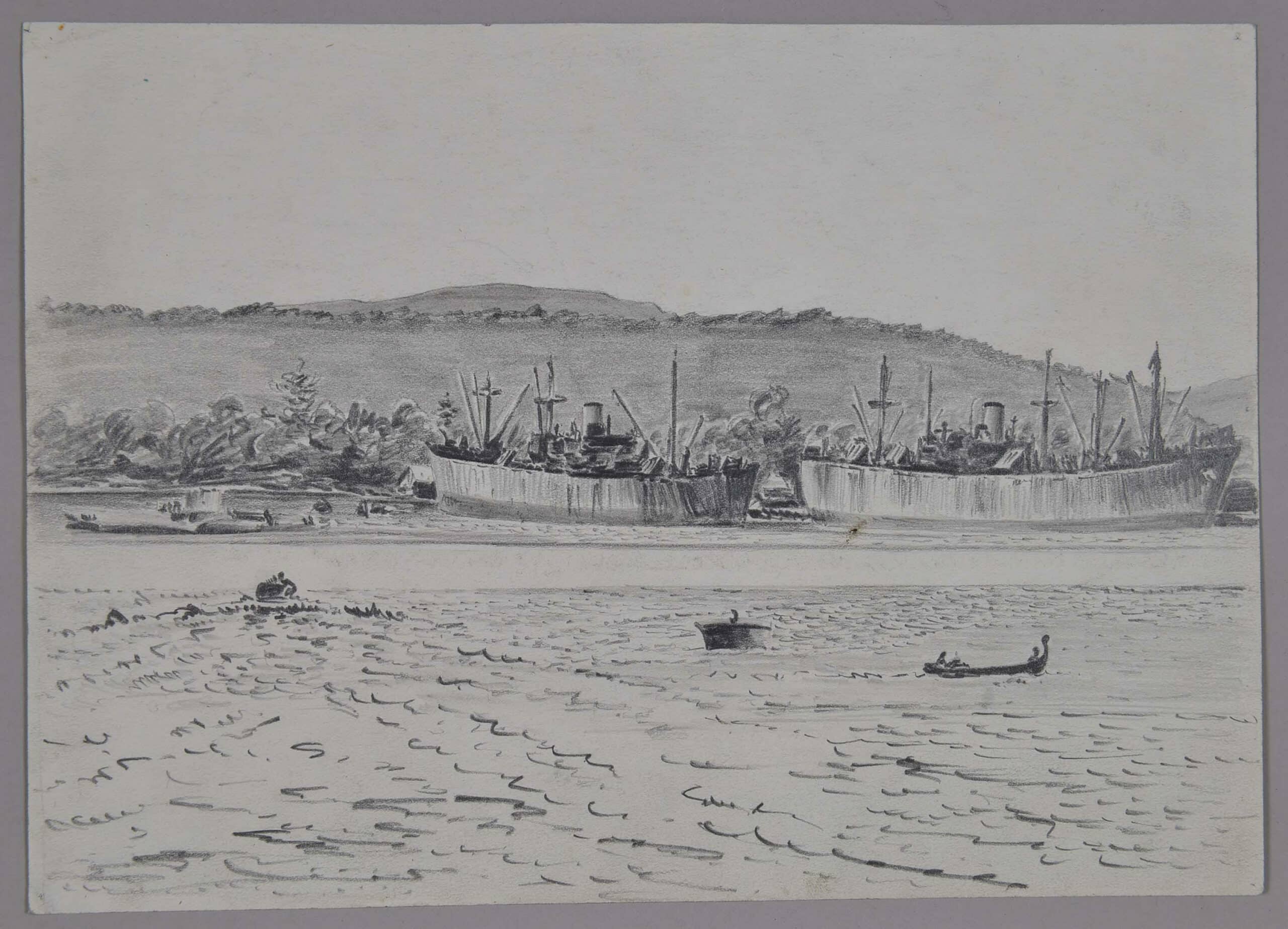 Following in the tradition of other active-duty war artists, Spence’s drawings depict scenes of camp-life ashore in the islands, and onboard ship, as well as scenes of battle. The drawings shown here are from the collection of the National Museum of the Royal New Zealand Navy, and a selection of these are displayed in the museum galleries.