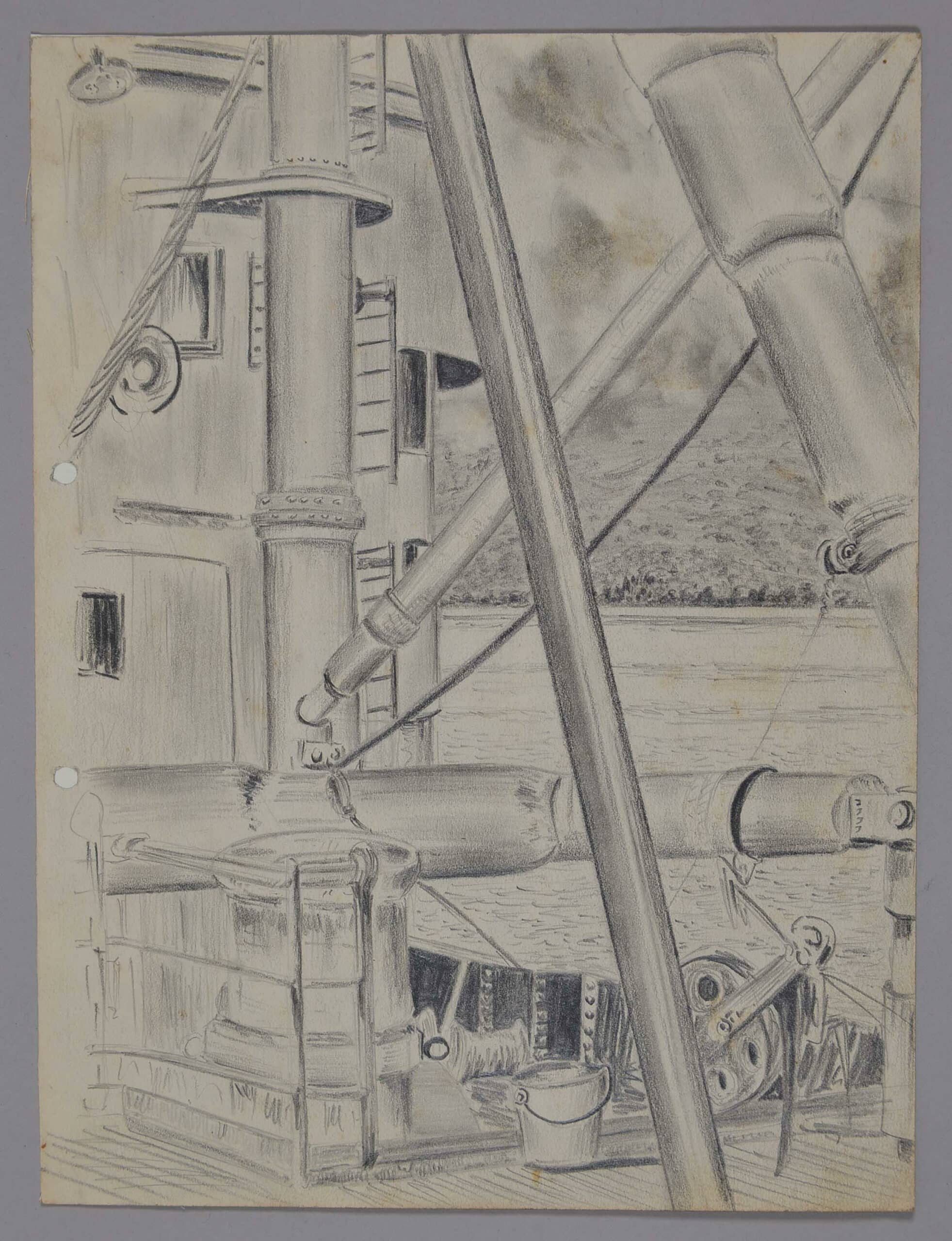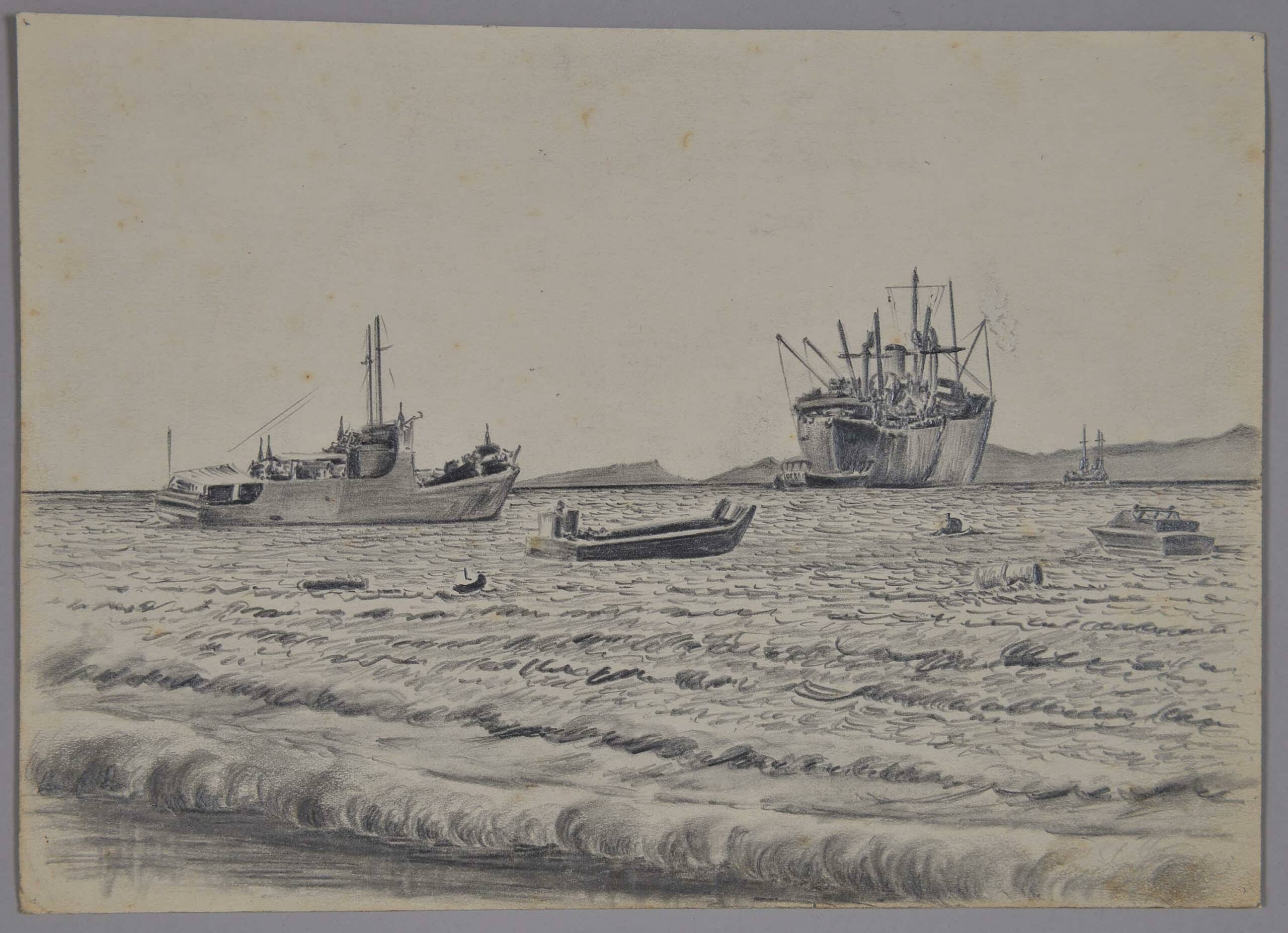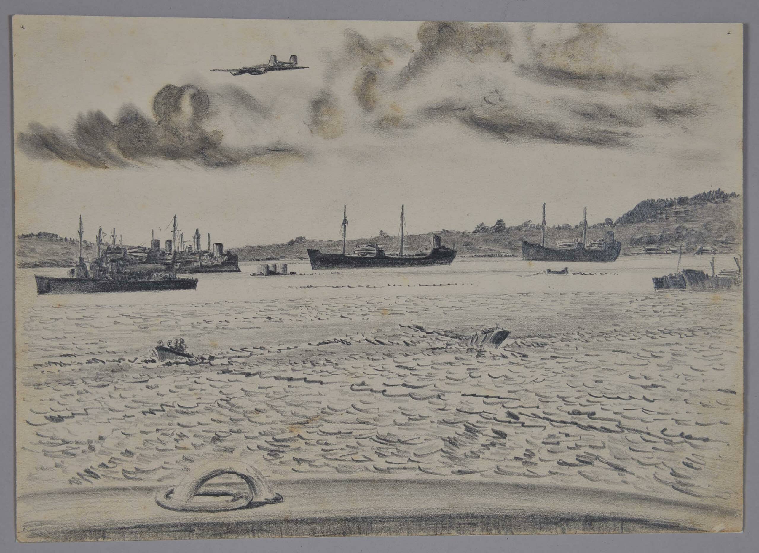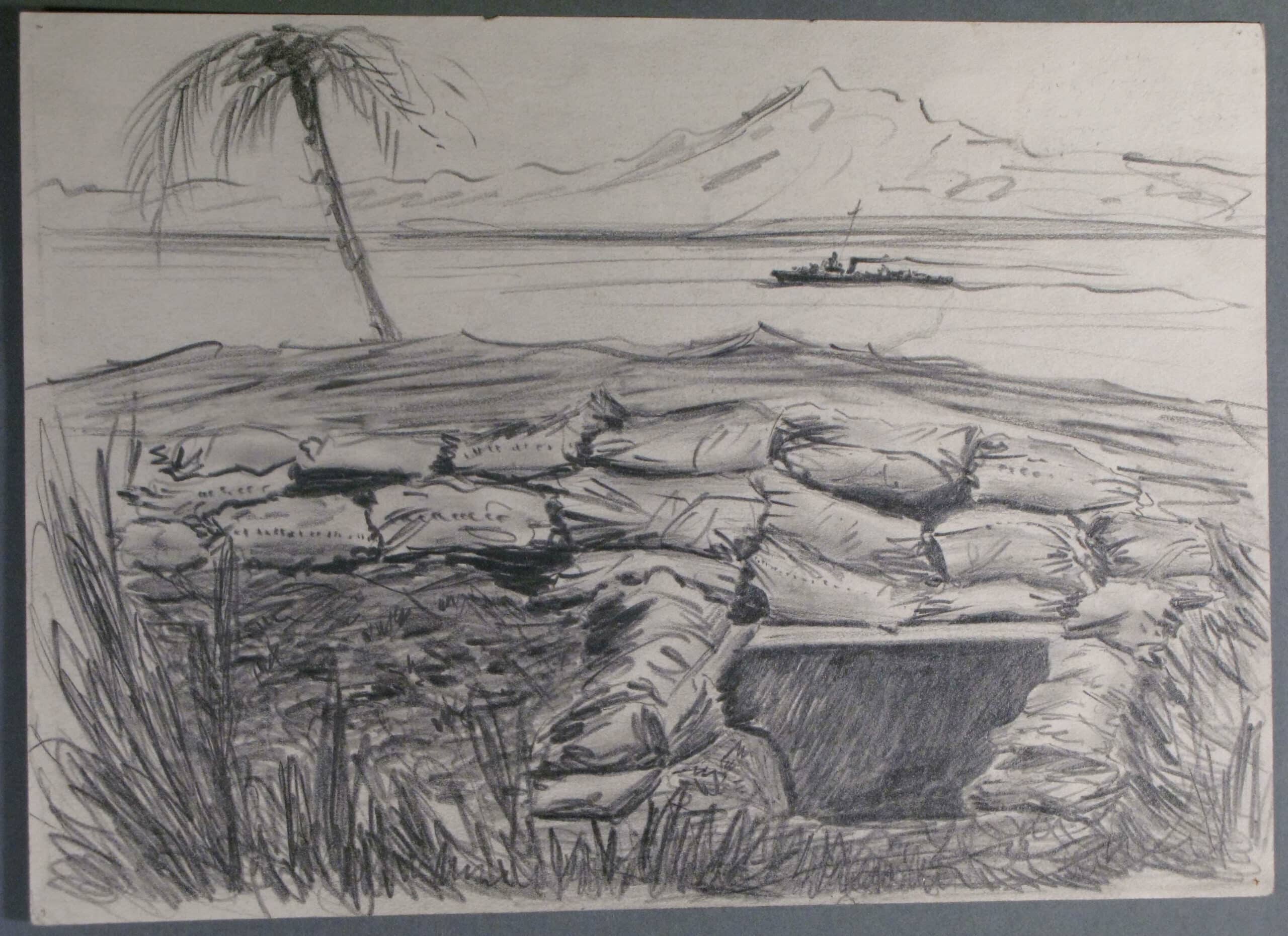 Following in the tradition of other active-duty war artists, Spence’s drawings depict scenes of camp-life ashore in the islands, and onboard ship, as well as scenes of battle. The drawings shown here are from the collection of the National Museum of the Royal New Zealand Navy, and a selection of these are displayed in the museum galleries.
