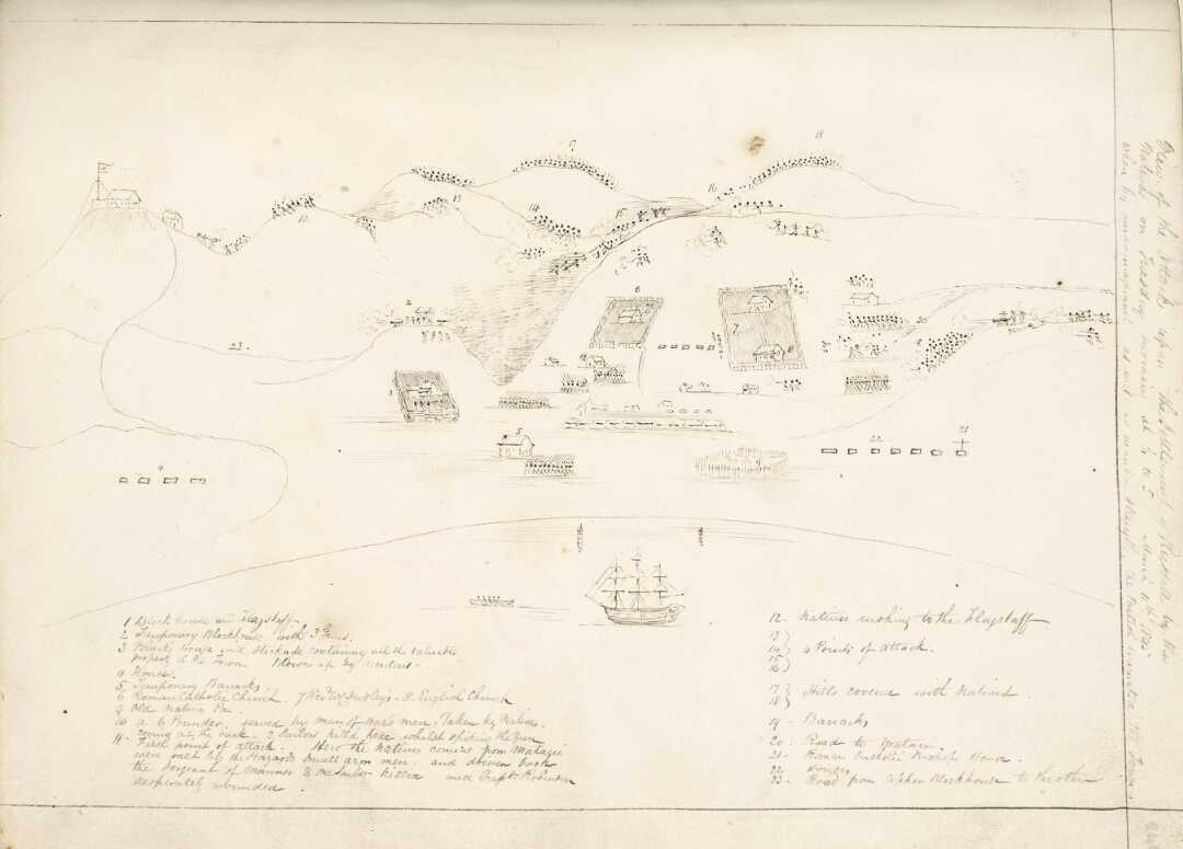 Later that day the townspeople were evacuated to the ships in the bay – including HMS Hazard, another sloop-of-war Victoria, and later to a British whaling ship Matilda.[5] Shortly after the evacuees left the main stockade at ‘Mr Polack’s house’, which had housed the majority of the town’s residents, a store of gunpowder unexpectedly exploded completely destroying the building, luckily without any casualties.[6]