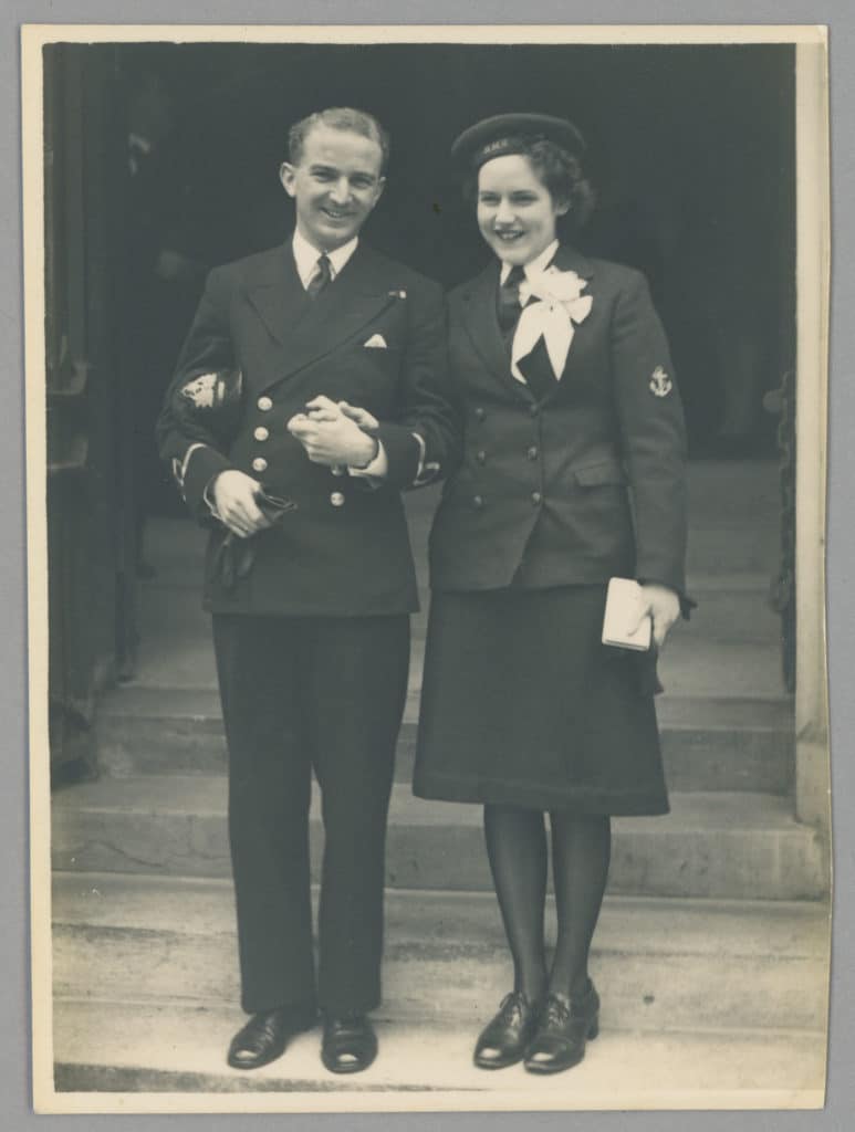 A wedding portrait of Sub Lt Douglas Francis RNZNVR and his bride, L/Wren Patricia Rowe RN taken 26th February 1944 outside Holy Trinity Church, Brompton Rd, London. L/Wren Rowe was employed as a signaller at HMS Vectis, a naval shore establishment at Cowes Castle on the Island of Wight. She met Lt Francis when he was posted to the same establishment. She was married in her WRNS uniform. Her husband donated her uniform to the museum in 1995 and we believe it is the one she was married in, although there is a later addition of a good conduct badge on the left sleeve.
