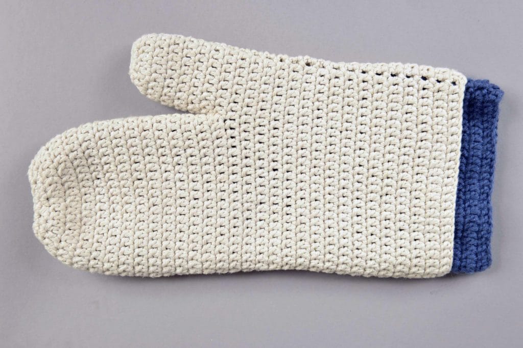 Using the pattern for minesweeper’s gloves provided in the ‘Comforts for Navy’ booklet, we have been able to replicate the style of hard-wearing yet comfortable mittens that would have been sent to the many sailors working on minesweeping vessels during and after the Second World War. They look very close in appearance to SLT Taylor’s gloves above, though his have a knitted lining instead of crochet, and his have cords added to the cuffs to secure the gloves on his hands. We don’t plan on doing any minesweeping with our gloves but reckon they might make good oven mitts!