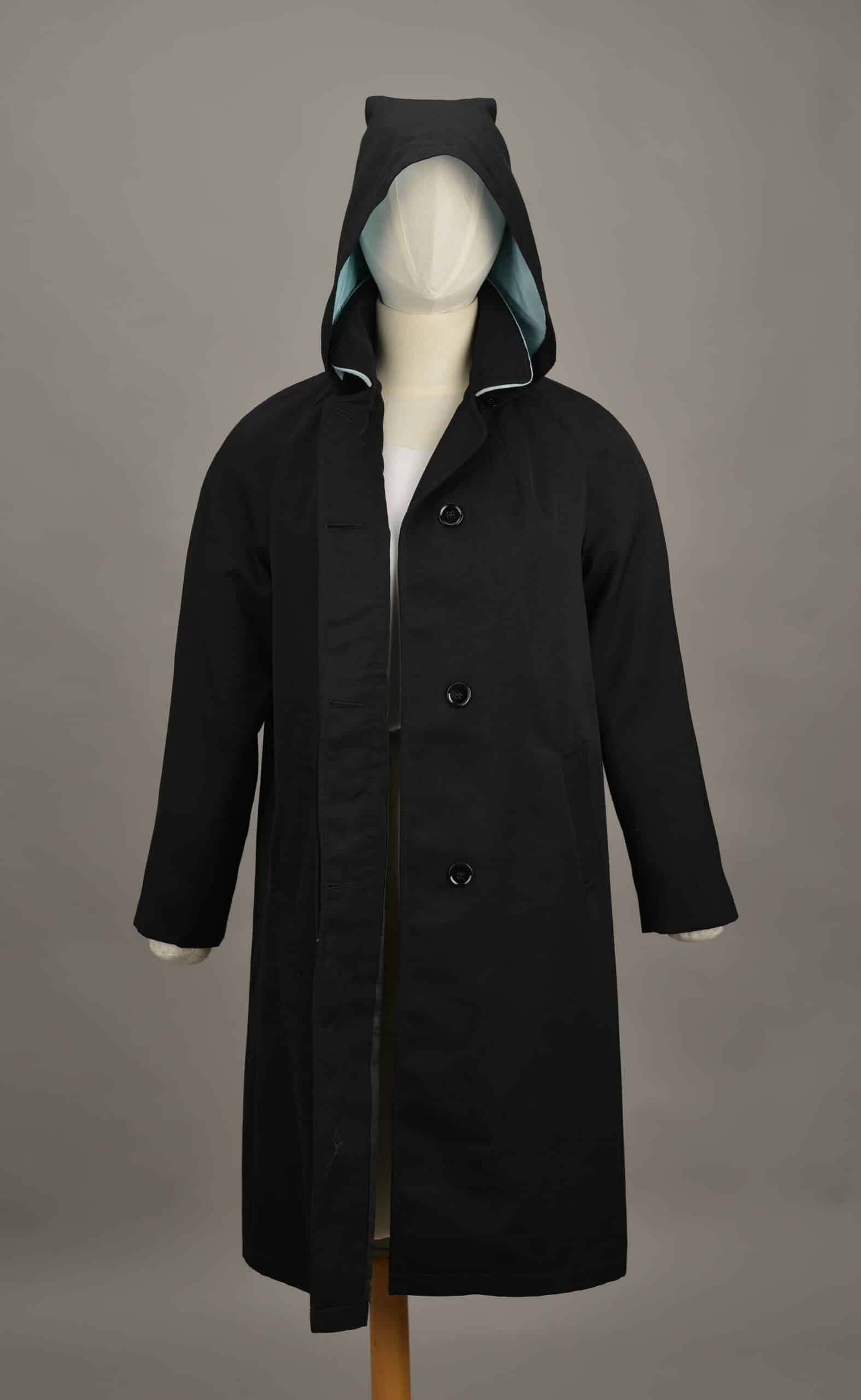 The coat is black, has light blue piping around the collar, and a blue-lined detachable hood. The body of the garment is made from waterproofed gabardine and has a button closure.