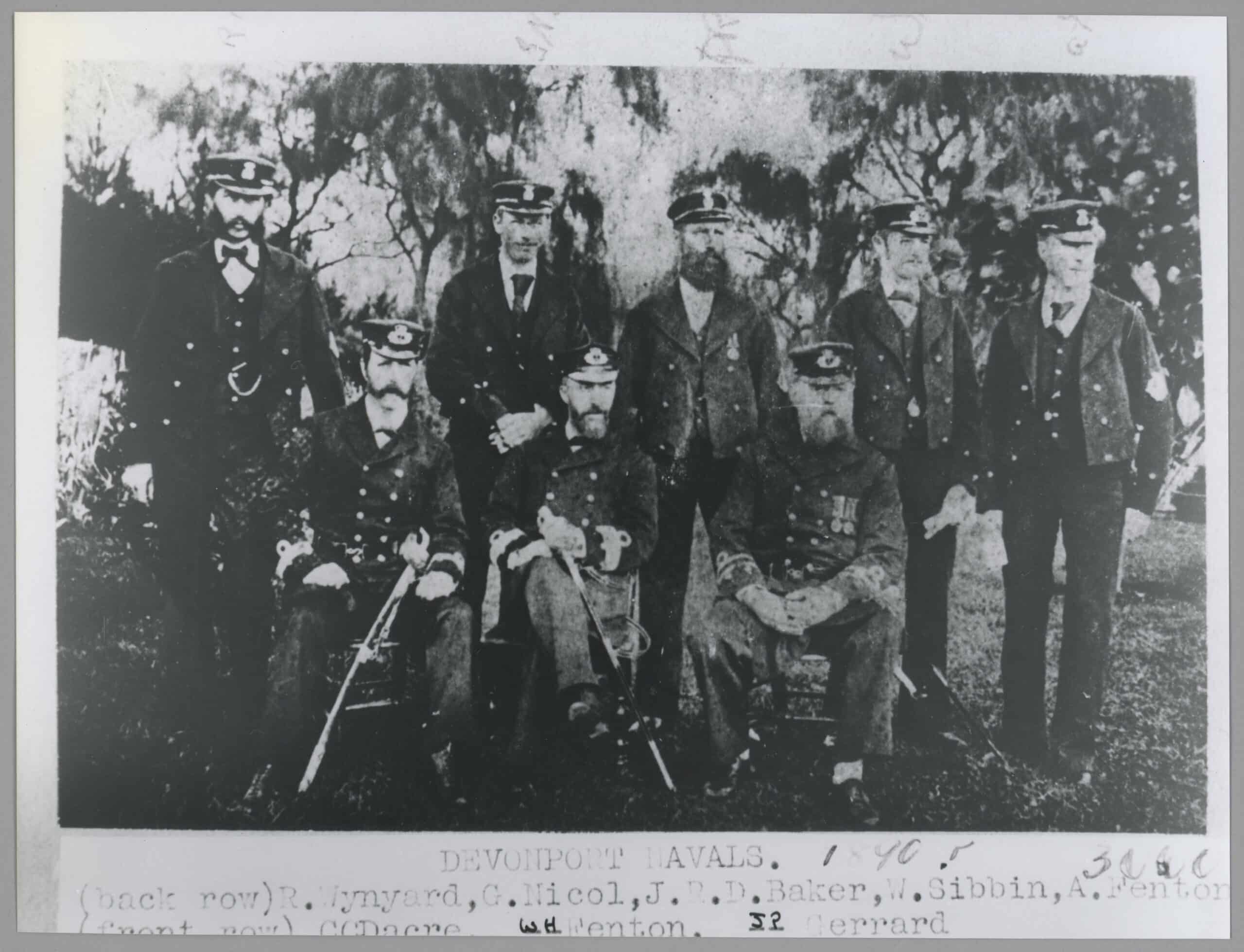 Dacre was a volunteer officer for many years, serving as Captain of the Devonport Naval Artillery and later, with the Ponsonby Navals. The photo shows him circa 1890 with other volunteer officers (front row, far left) – probably holding the very sword now in the museum collection!