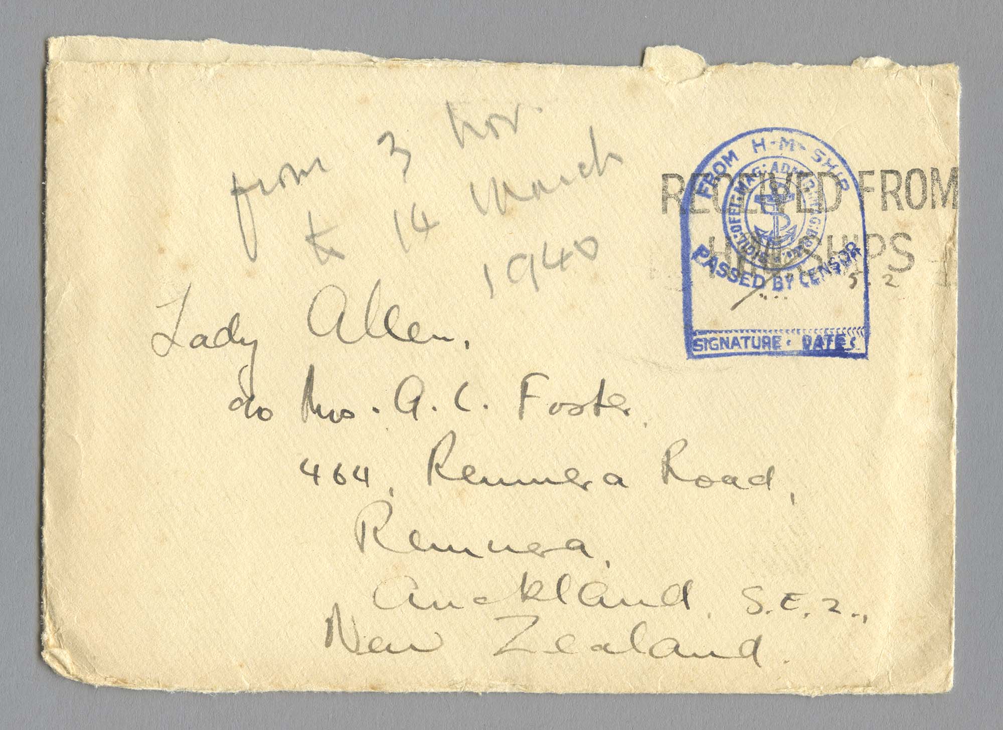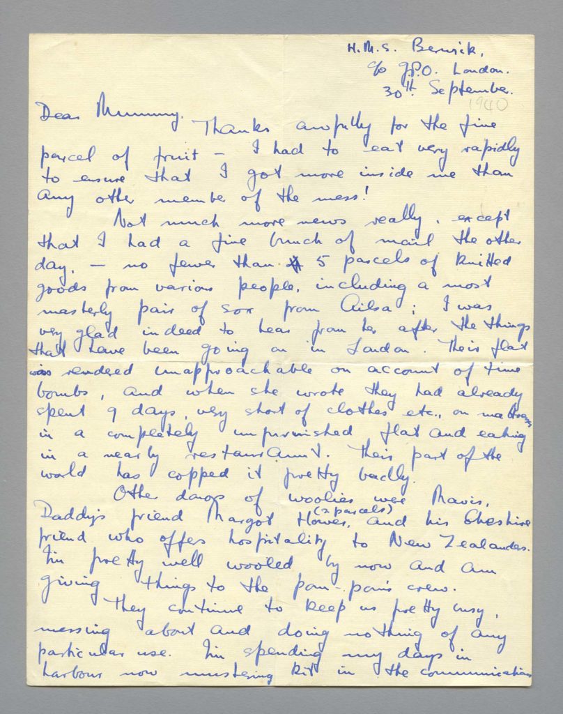 Peter corresponded with his mother regularly. The collection contains 154 personal letters from Peter to his mother which approximated to one per week. Every one of his letters begins, ‘Dear Mummy’ and is signed ‘Your loving son Peter.’ Peter informs her about his experiences in the Royal Navy and adventures abroad, although the specific details about his service were always heavily censored.