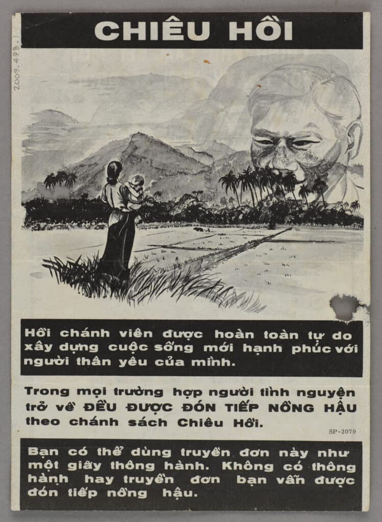 This leaflet depicts a woman standing in a field holding a baby with a large ghostly face of a man looking down upon them – presumably representing the Viet Cong fighters who are separated from their families. The leaflet actively promotes the idea that voluntary defectors will be warmly welcomed by the South Vietnamese Government, promising that they will be able to rebuild their lives and reconnect with loved ones. The translation reads as follows:[9]