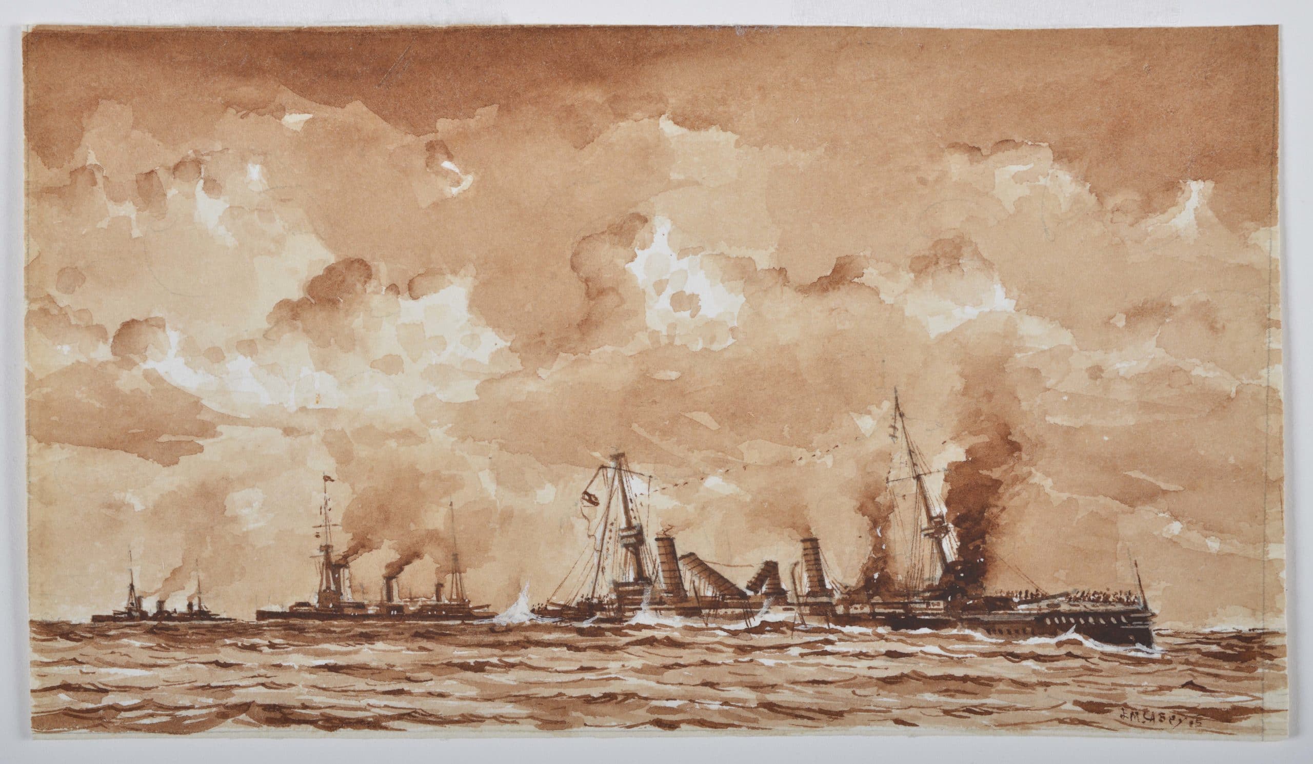 This watercolour from our collection depicts the Battle of the Falkland Islands which took place on 8 December 1914. During the previous month, the British Royal Navy had suffered its worst naval defeat in the last 100 years to the Imperial German Navy at the Battle of Coronel. In retaliation, the Royal Navy sent a force of cruisers to track down the German ships. The German Navy had planned an attack to raid the British supply base at Stanley in the Falklands Islands, but unknown to them, the British fleet had arrived in port the day before. It was a bright and sunny day with excellent visibility so the German cruisers were detected early before they reached the port. Once spotted, the faster and more powerful British fleet pursued the German ships. Even though, the German fleet sailed away at full speed, they were no match for the British cruisers. Once it became clear they could not outrun the British fleet, the Admiral of the German fleet, Graf Maximilian von Spee commanded his two armoured cruisers, SMS Scharnhorst and Gneisenau to turn and fight, allowing his three light cruisers SMS Nürnberg, Dresden and Leipzig, to have a chance to flee. However, Dresden was the only ship to escape and the rest were sunk with few survivors. The battle is commemorated every year on its anniversary as a public holiday in the Falkland Islands.