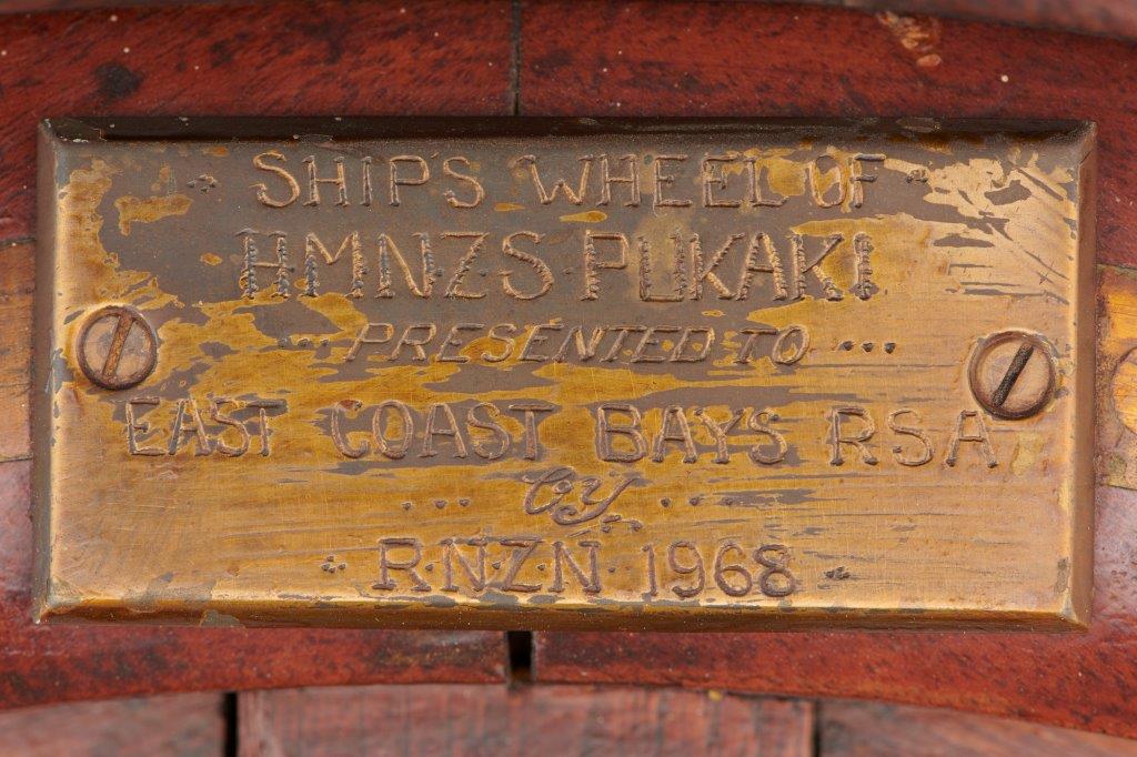 After the ship was decommissioned in 1965, the wheel had a plaque added (which you can see in the photo below) and was presented to the East Coast Bays RSA. The RSA donated to the wheel to the museum in 2018 when their building was sold.