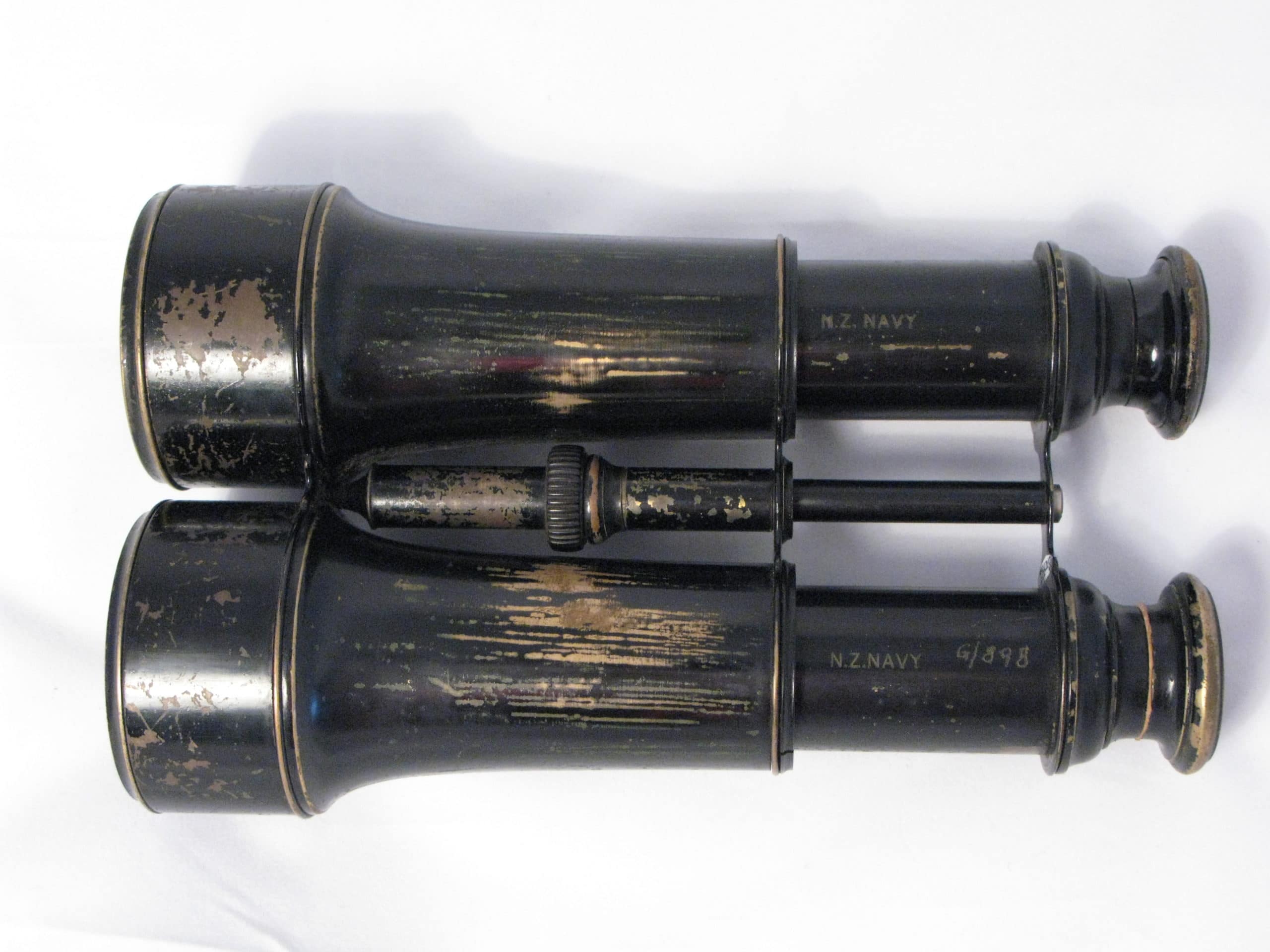Binoculars complete with brown leather case. Glasses have no manufactures mark but each barrel is marked: ‘NZ Navy’. Case was made by George Bussey & Co. Ltd 1917.