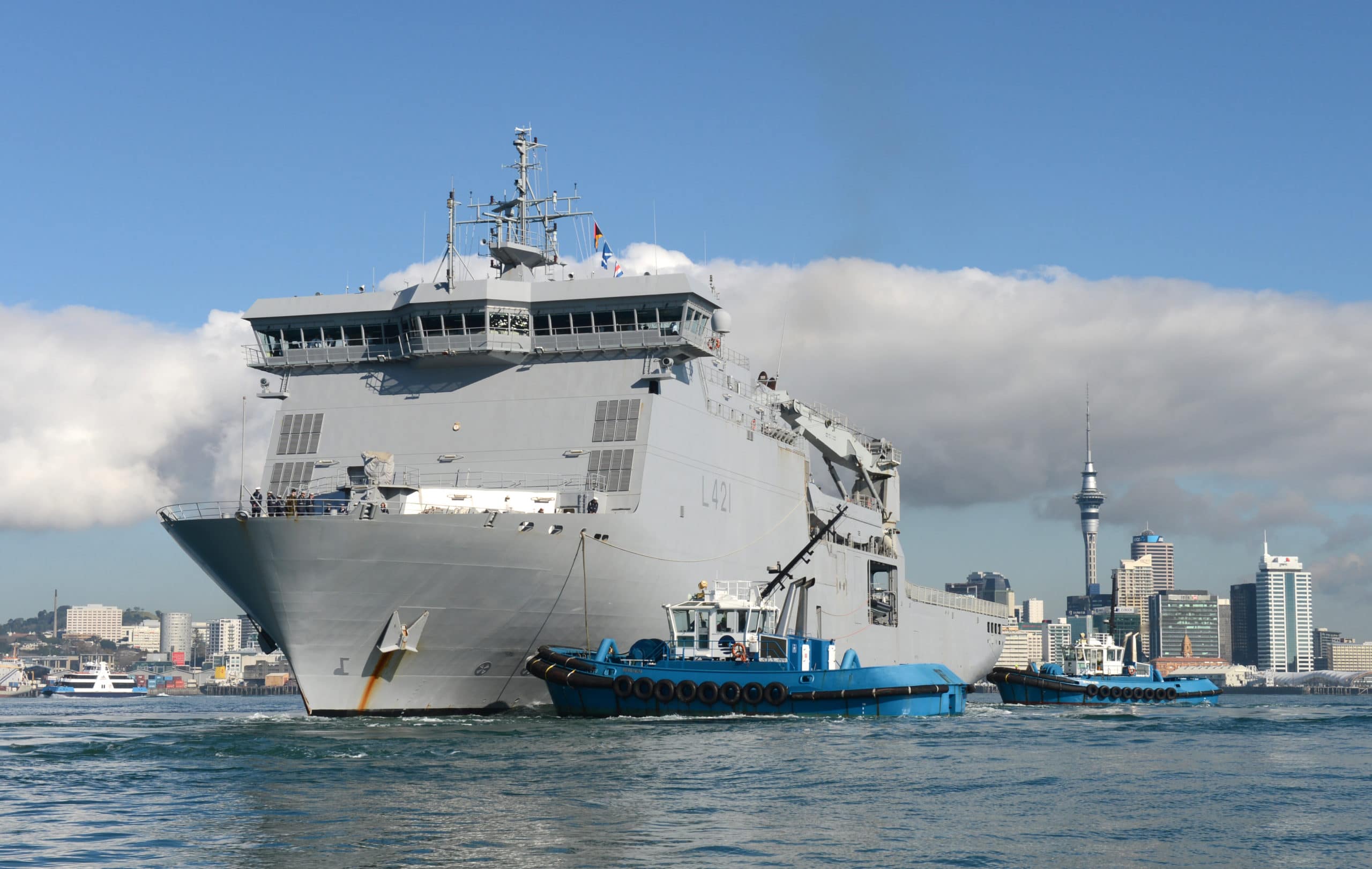 As part of the Project Protector plan the RNZN would reequip with a multi-role vessel that could support disaster relief, humanitarian operations, amphibious operations, and logistical support operations. The design was based on a Dutch RORO [roll on-roll off] vessel that did not have a well deck but could embark directly from the stern ramp or through the fitted LCMs. To facilitate ease of landing for vehicles and cargo the LCM were fitted with a built in stable lock system on the forward ramp. The shop has been ice-strengthened for operations in the Ross Sea. The ship is designed to carry 360 troops with their personal equipment including a company-sized landing group [250]. It can carry five helicopters including the new NH90 light helicopters[1] or the Seasprite naval helicopters. Up to sixteen light armoured vehicles [the LAVs], fourteen light operations vehicles [jeeps, light trucks], 24 cars, and up to 33 standard shipping containers. As part of her role she has been fitted with a large distiller and can produce up to 100 tons of fresh water per day. Initial construction was undertaken at Merwede Shipyard in Rotterdam and was then towed to Tenix defence yards for fitout and completion.