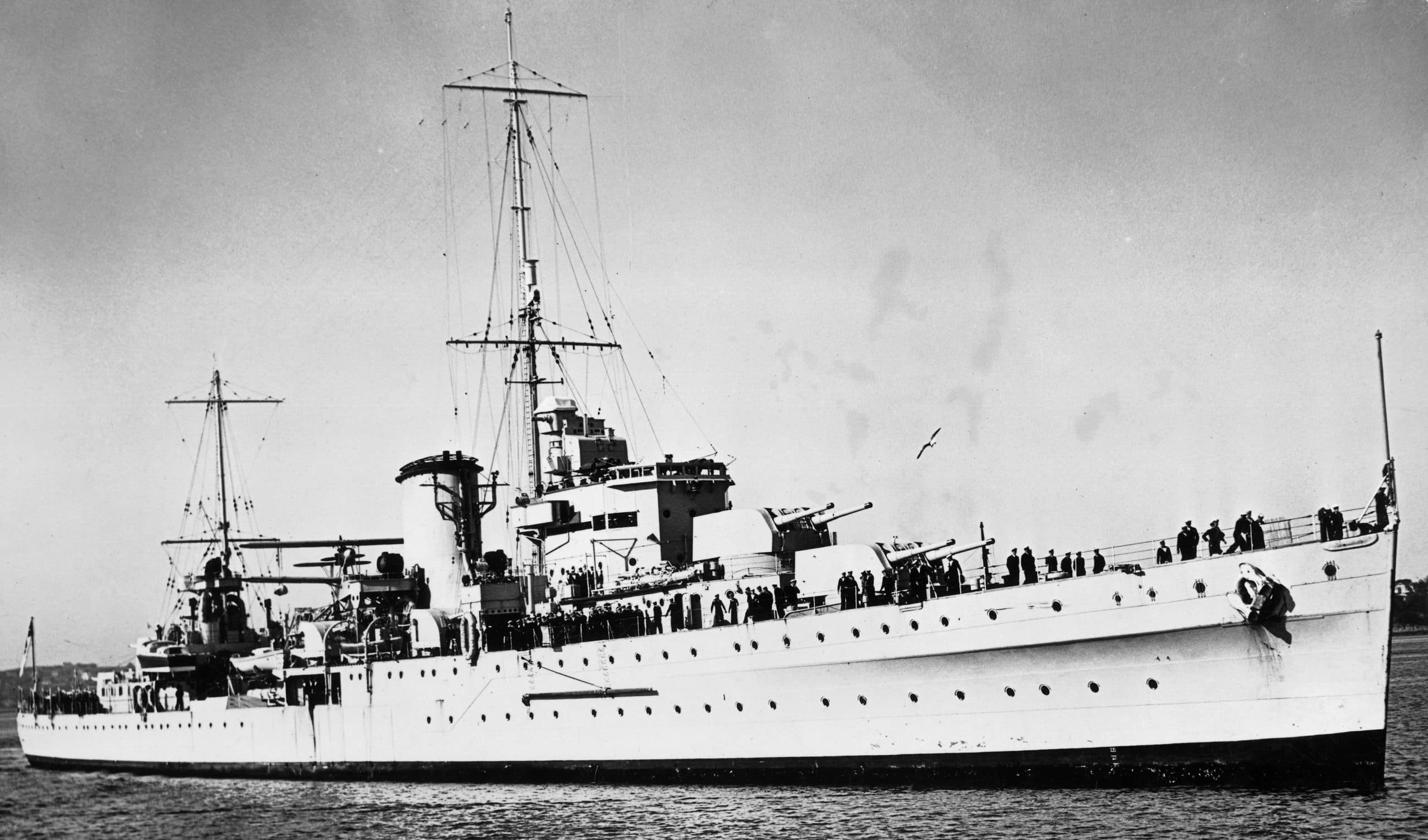 HMS Leander was built in His Majesty’s Dockyard Devonport, England. A Light Cruiser, Leander was laid down on 8 September 1930, launched on 24 September 1931 and commissioned into the Royal Navy on 23 March 1933. The ship was acquired by New Zealand, on loan; along with a sister ship HMS Achilles, to replace HM Ships Dunedin and Diomede, respectively. To accommodate the arrival of the new ships work was undertaken expanding naval base facilities, the dockyard and lengthening Calliope Dock.