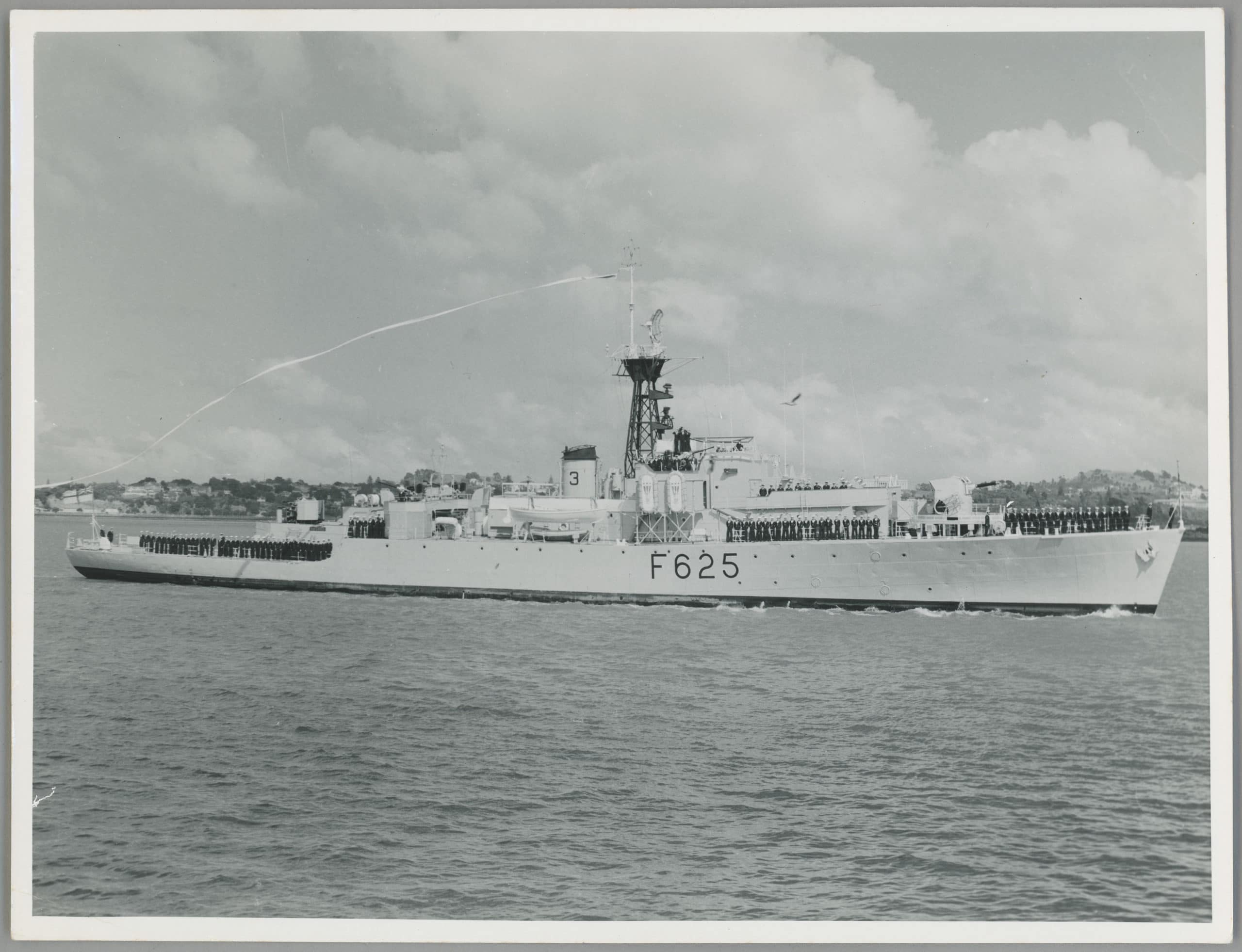 HMNZS Rotoiti was handed over to the RNZN at Portsmouth and entered service with the RNZN on 6 June 1949. The government had thought of calling the frigate HMNZS Tarawera. During the process of making up the cap tallies the name was misspelled as HMNZS Rotoite. The ratings in the commissioning ship’s company had to wear these until they were later changed. [2]