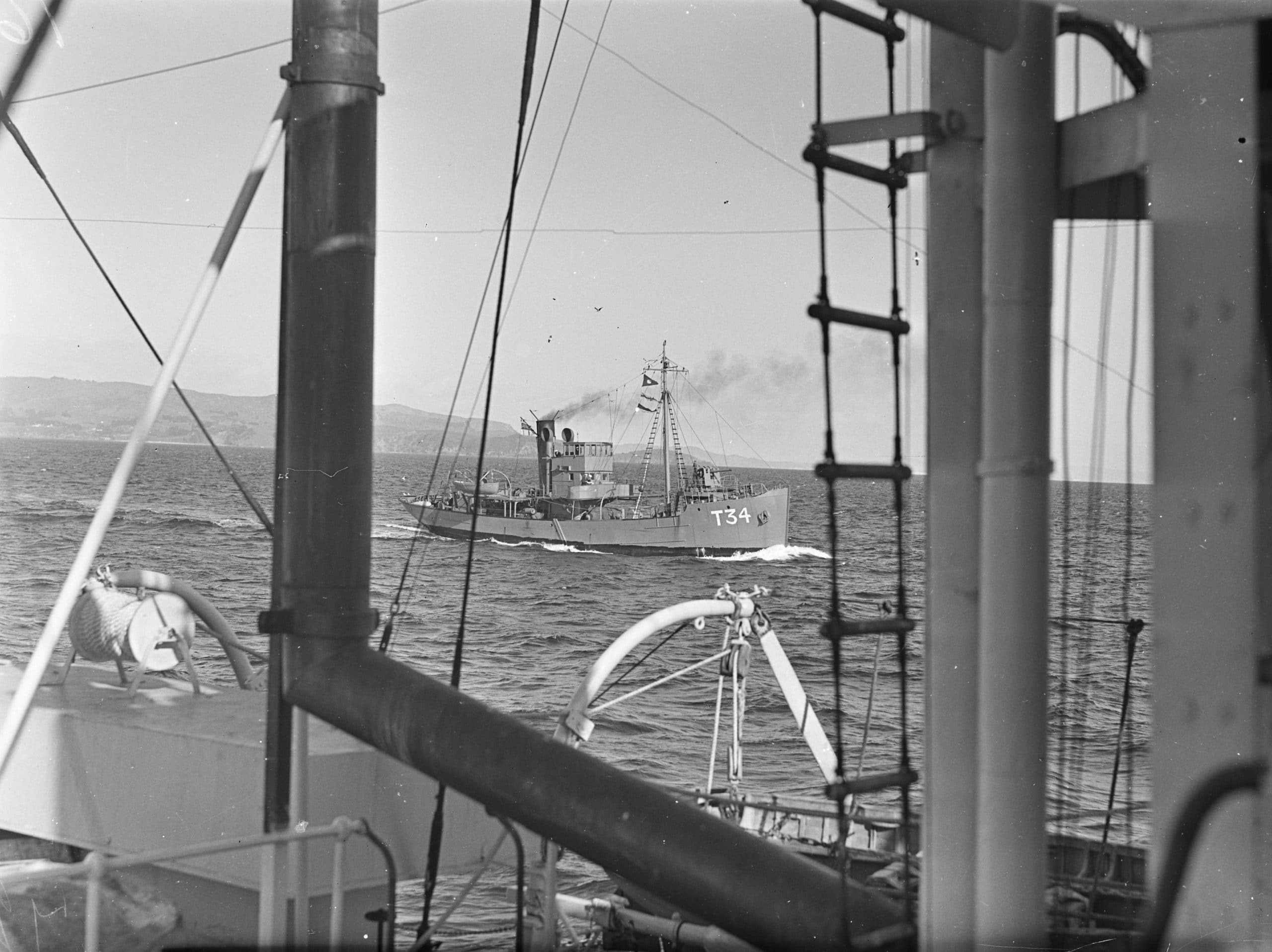 The designs for the Castle-class minesweepers were based on a commercial trawler taken up for service by the Royal Navy in 1915. Between 1916 and 1919 200 of this type of minesweeper were built. Two served with the New Zealand Division as HMS Wakakura and James Cosgrove. In 1940 facing a requirement for minesweepers to operate in home waters, the New Zealand government chose this design as it was simple enough to be built with the country’s limited ship construction facilities. The steel-hulled minesweepers were given New Zealand river names. The Waiho River in Westland on the west coast of New Zealand’s South Island.