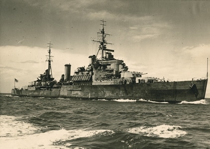 When the Second World War broke out in 1939, Davis-Goff was serving in Achilles and was on its upper deck in charge of the torpedo tubes during the Battle of the River Plate on 13 December 1939. One of his tasks was to make the depth charges safe, a hazardous role with danger not only from enemy fire, but also from the blast of the ship’s own six-inch guns. For this he subsequently received a Mention-in-Dispatches. In 1941 Davis-Goff underwent further courses for promotion in the United Kingdom and was promoted to Acting Lieutenant in May, being confirmed in the rank eight months later. As with his earlier warrant, he was the first New Zealander to reach a commissioned rank from the lower deck. After service with the Royal Navy, during which he escorted a convoy to Russia, Lieutenant Davis-Goff joined the cruiser HMNZS Leander in June 1942. He was present when she was badly damaged during the Battle of Kolombangara in the Solomon Islands. He stayed with Leander for much of the ship’s refit in the United States, being promoted to Lieutenant Commander in August 1944. In February 1945 Davis-Goff joined the cruiser HMNZS Gambia , which was operating as a unit of the Fourth Cruiser Squadron of the British Pacific fleet. Gambia was off Japan at the cessation of hostilities in August 1945, and he was in command of its landing party, which took the surrender of the Japanese naval base at Yokosuka. For his actions in the latter part of the war he was awarded the DSC.