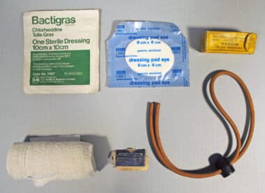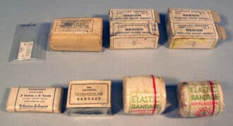 Many of the items in a Second World War first aid kit will be familiar to anyone who has done a modern first aid course. Wound dressings such as elastic bandages, triangle bandages, and gauze were compressed, and sterilised with instructions printed on the packaging. Safety pins were used to secure dressings.