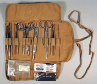 For wounds that required surgery, ships carried a variety of tools. These included simple surgical tools such as scalpels, tweezers, scissors, clasps, needles, and sutures. These tools would be used to remove the patient’s clothing, extract shrapnel, and to close wounds.