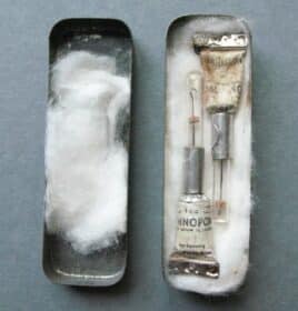 An interesting difference between sutures of this period and their modern equivalents is their material and storage. Silk sutures were stored in glass vials filled with an alcohol solution that would keep the sutures sterile and protected. Examples of these sutures can be seen in the Navy Museum’s Second World gallery.