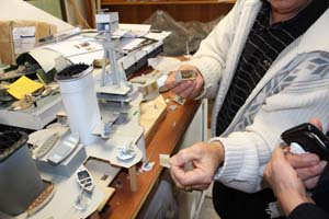 erstructure and gun turrets are all hand crafted by Graham using wood and sheets of printer’s plate. Fittings such as bollards and the individual crew members are spin cast metal and are hand-painted; not a job for an unsteady hand and largely done without the assistance of a magnifier or glasses!
