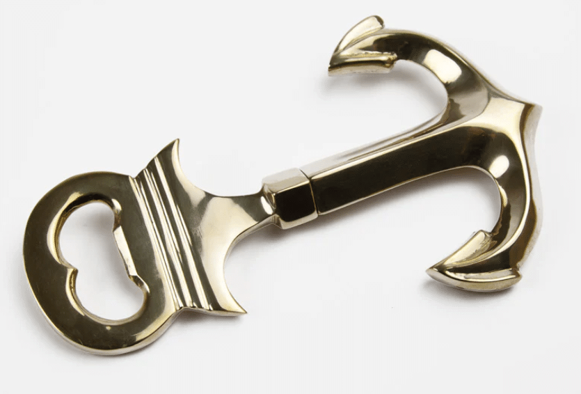The flukes of the anchor give a good purchase on stubborn corks. Chunky polished brass castings with stainless steel ‘worm’ (corkscrew thread).