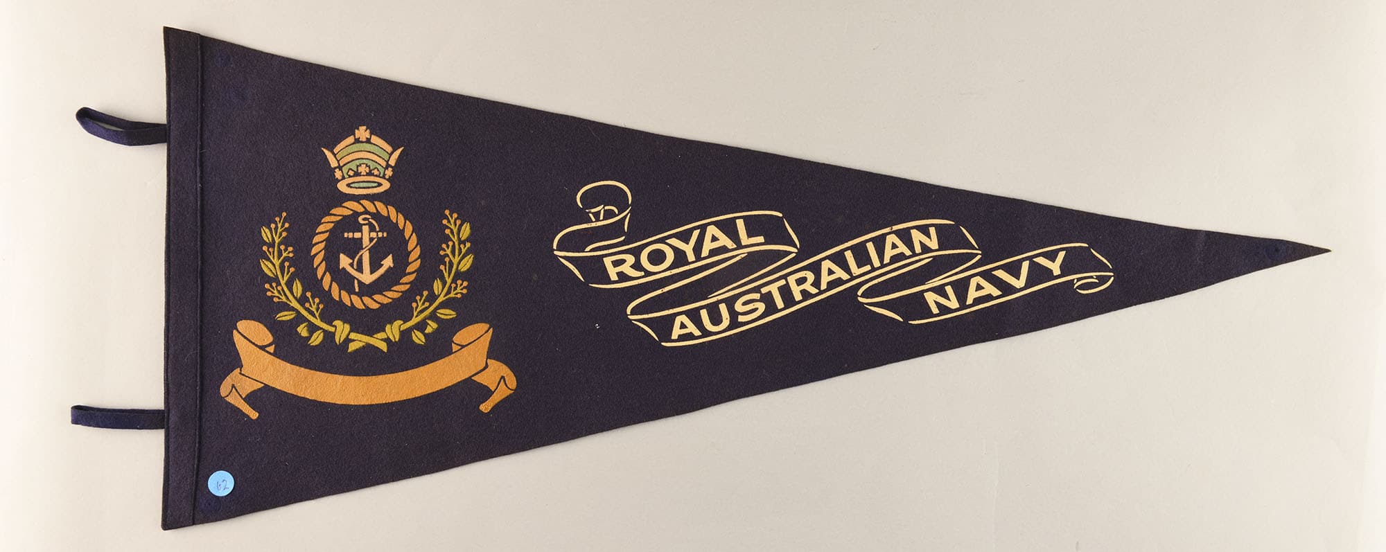 Decorative pennant with the Royal Australian Navy (RAN) crest. It would likely have been produced as a souvenir for sailors to purchase. Donated to the collection by the Royal Naval Men’s Association, this pennant serves as a symbolic reminder of the close relationship between the Royal New Zealand Navy (RNZN) and the RAN. Since the 1920s the two navies have conducted numerous joint exercises and continue to work collaboratively in areas of mutual interest.