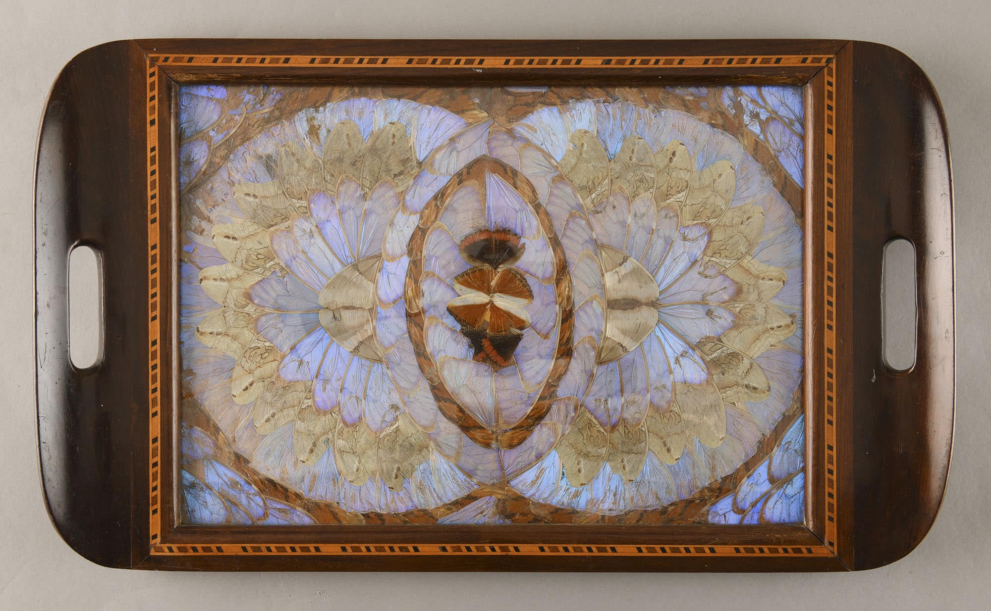 The crew of HMS Achilles was gifted this tray, decorated with butterfly wings, by the people of Uruguay after the Battle of the River Plate in 1939. It was presented to Lieutenant George Raymond Davis-Goff in acknowledgement of his actions as Torpedo Officer during the battle.