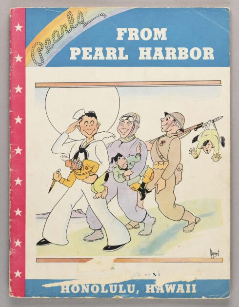 This magazine began as the Fleet Recreation Bulletin which provided a summary of sports events and available recreation facilities, circulated to ships of the Fleet and shore stations in the Hawaiian Islands. This special issue, published by the Honolulu Star-Bulletin, the second largest daily Newspaper in Hawai’i, was printed after a flood of requests for additional copies of the content. Compiled within are cartoons, verses, and editorials. The creators of which are attributed to the “Specialist”, “Michael Angelo”, and “The Loud Speaker” – pen names allowing for author anonymity, making it easier for unendorsed, less ‘politically correct’, works to be published.