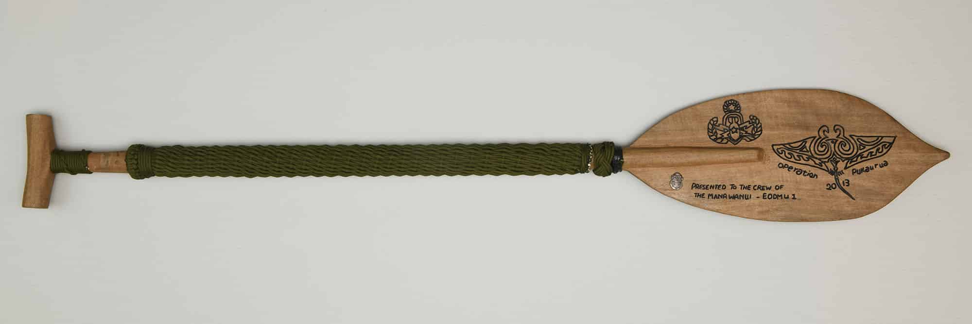 The crew of HMNZS Manawanui (A09) were presented this paddle for their assistance during Operation Pukaurua in 2013. Pukaurua was a military operation tasked with clearing Second World War explosives and munitions from around Munda in the Solomon Islands. Over 2000 items, together weighing more than four tonnes, were successfully removed from the region.