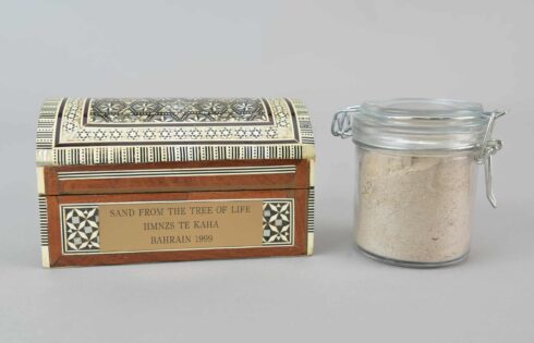 The sand was collected from around Shajarat-al-Hayat, or the Tree of Life, and was originally stored in this presentation box. Shajarat-al-Hayat has survived alone in the middle of the desert for 400 years.