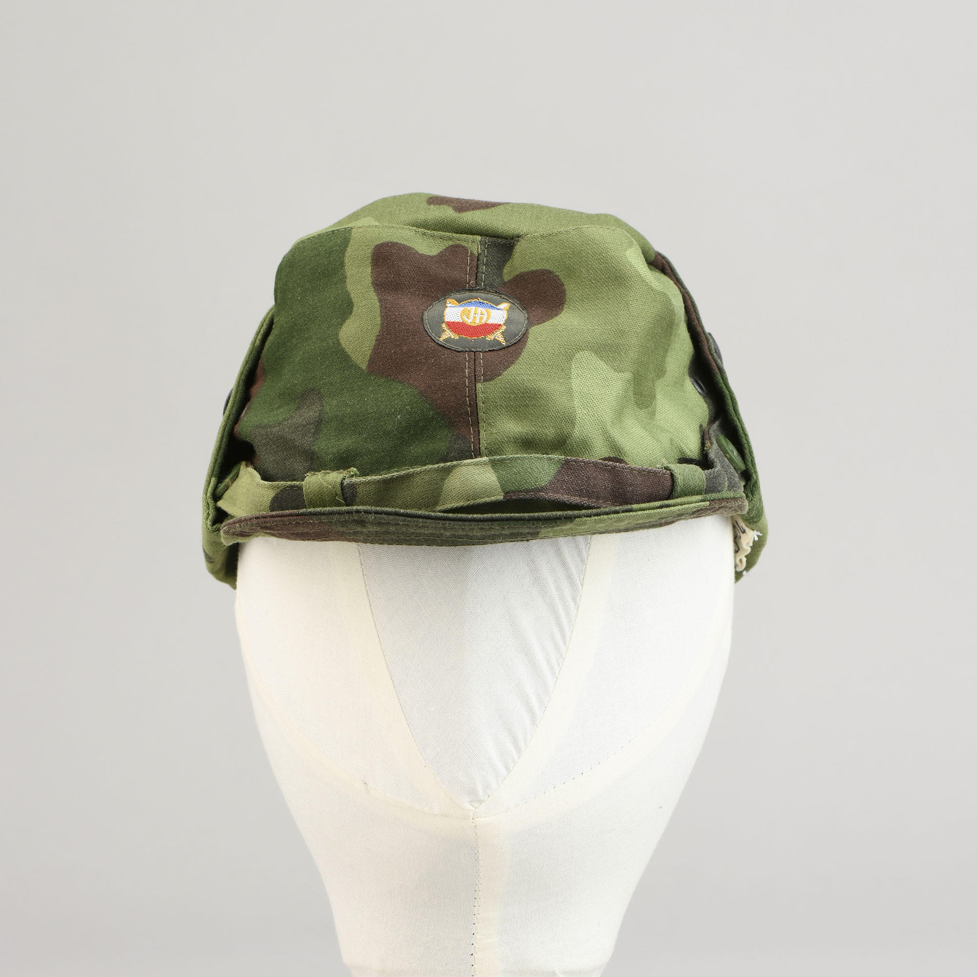This cap was acquired by Commander Gwyn Rees in 1992 from Banja Luka (Northern Bosnia). Rees was serving in Yugoslavia (now Croatia, Montenegro, Serbia, Slovenia, Bosnia and Herzegovina, and Macedonia) as part of the United Nations Protection Force (UNPROFOR). He was one of nine military observers who supported the delivery of humanitarian aid to the region.