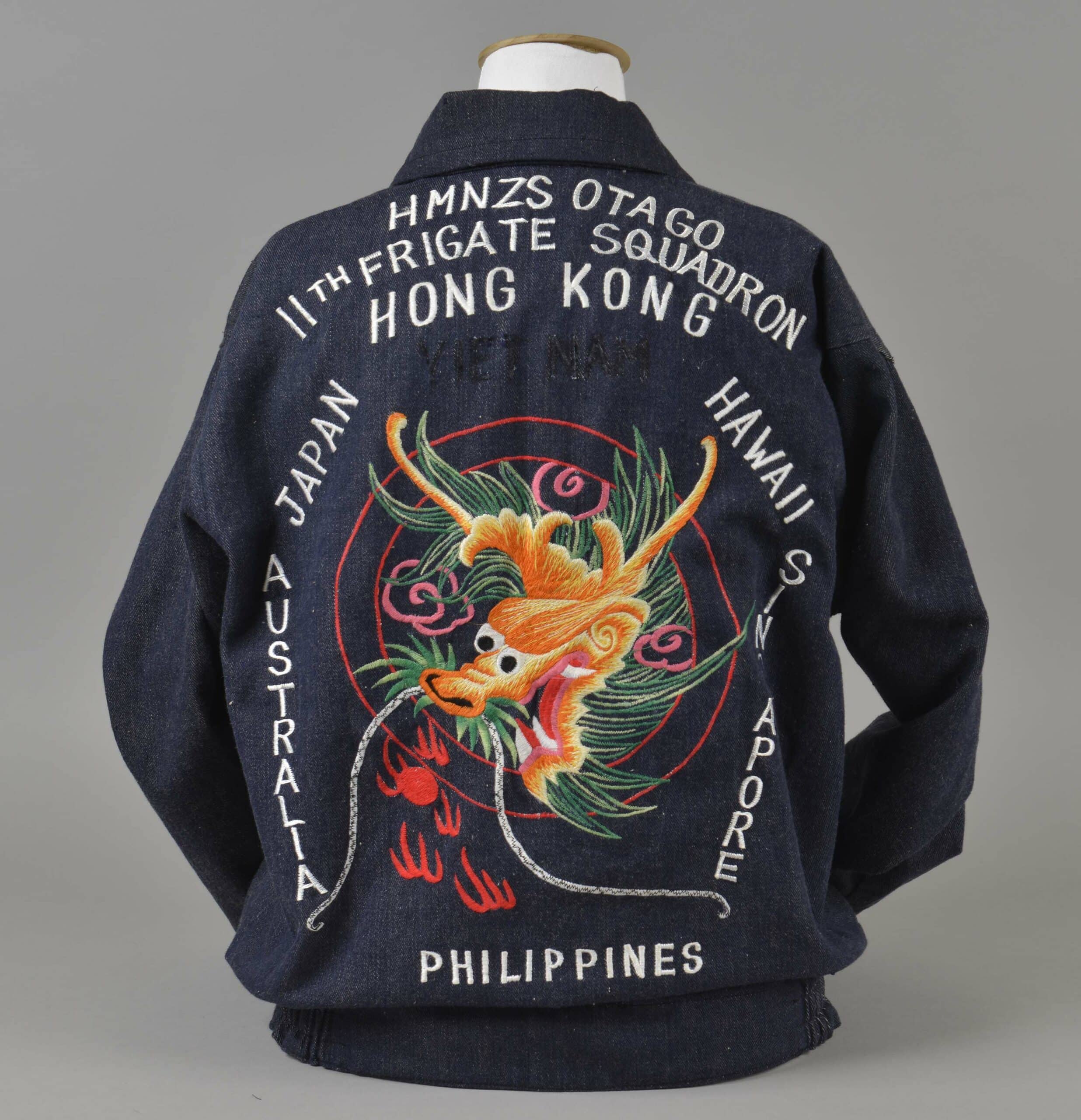 This souvenir denim jacket is embroidered with the image of a dragon and the names of the countries visited by HMNZS Otago during her South-East Asian tour in 1970. Otago was deployed first to Pearl Harbor, in Hawai’i, for training with the United States Navy, and then to South-East Asia as part of the Far East Strategic Reserve (FESR).