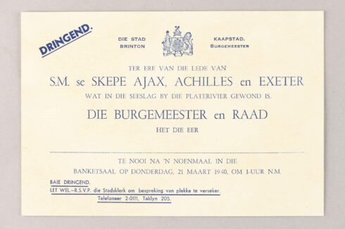 The invitation for the event is written in Afrikaans on one side and English on the other, and the menu has been signed by members of the ship’s company of HMS Exeter.