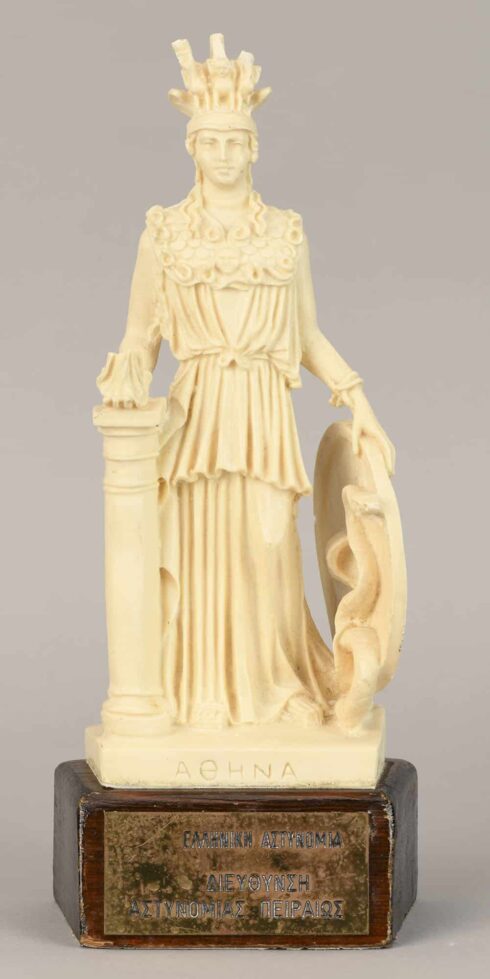 The crew of HMNZS Canterbury (F421) acquired this statue of the Greek goddess Athena while on deployment to Crete in 1991. This deployment was part of commemorations for the 50th anniversary of the Battle of Crete. Locals welcomed the return of the New Zealand veterans, and together they participated in a range of events.