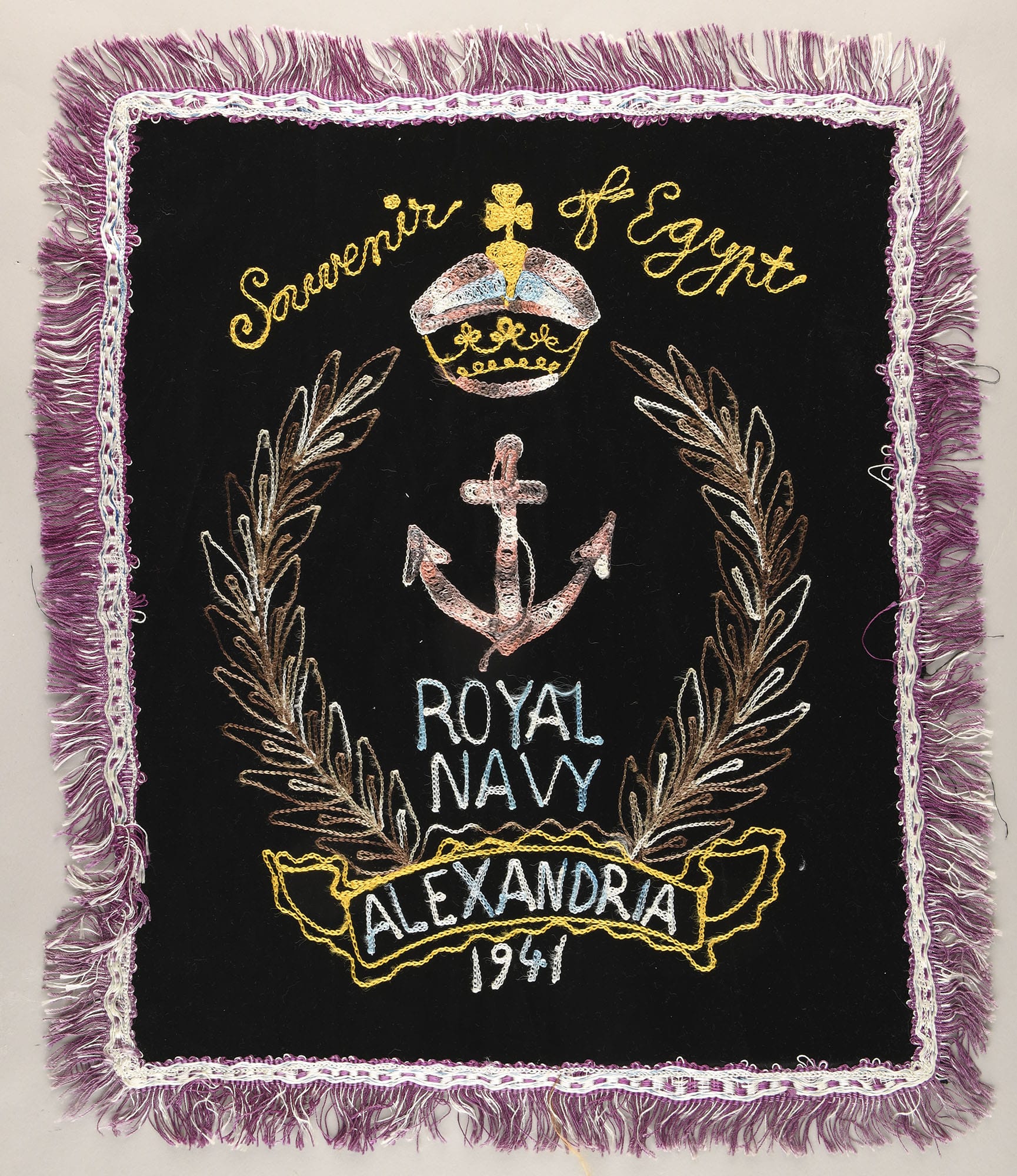 One of two embroidered cushion covers purchased in Egypt in 1941 by Able Seaman Jack True, likely sent as gifts to his family in New Zealand. At this time True was posted to HMS Neptune, which had arrived in Alexandria earlier that year to bolster the 7th Cruiser Squadron in the Mediterranean.