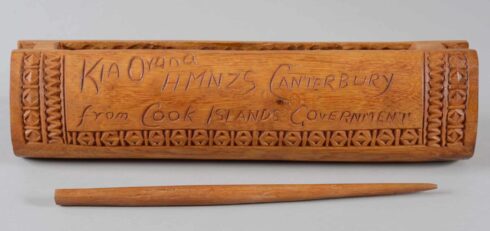 HMNZS Canterbury (F421) was gifted this wooden tokere (slit drum) by the Cook Islands Government in the 1970s. In 1973 Canterbury relieved HMNZS Otago (F111) in order to continue protesting the French testing of nuclear weapons in the Pacific as a part of Operation Pilaster (deployment to Mururoa). It is believed that the tokere was gifted in recognition of Canterbury’s efforts in the region.